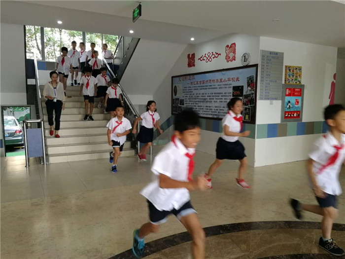 只聽空襲警報聲響起,五年級師生迅速從教學樓的五樓教室撤離,在撤離過程中做到迅速、及時、有序、不慌。如果是真實的情況,那么大家應該撤離到相應的防空洞進行躲避,而目前學校只有操場,所以作為演習,學生們就撤離到操場。到達操場之后,每位學生報數,班長進行清點人數,之后向班主任報告,班主任再向年級組長報告學生和教職工的人數,最后年級組織向大隊輔導員老師進行報告。僅僅一分多鐘的時間就完成了整個流程。