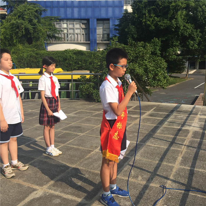 9月18日在世外小學每周一的升旗儀式上,五年級學生作為示范向全校師生進行了防空演習。