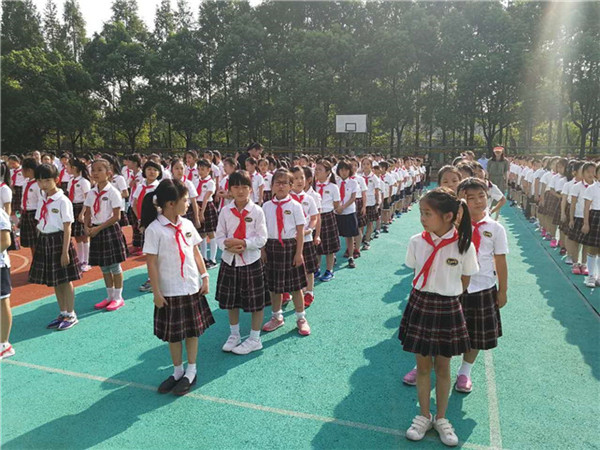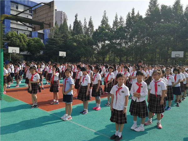 9月18日在世外小學每周一的升旗儀式上,五年級學生作為示范向全校師生進行了防空演習。