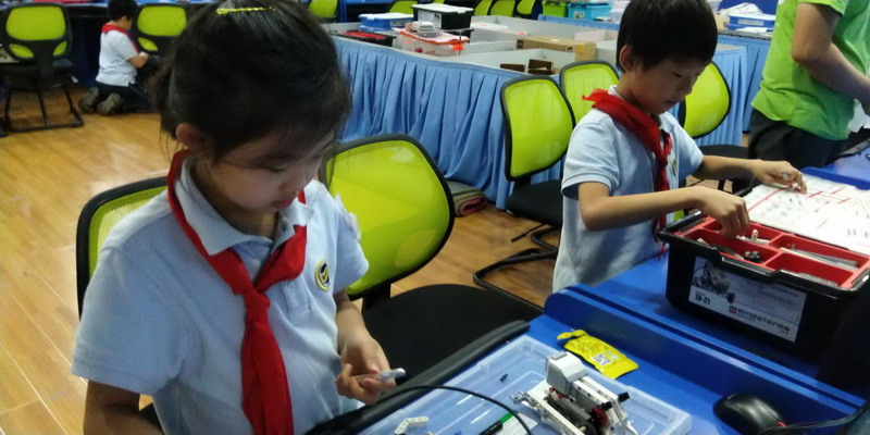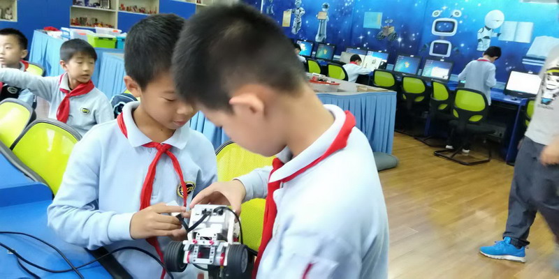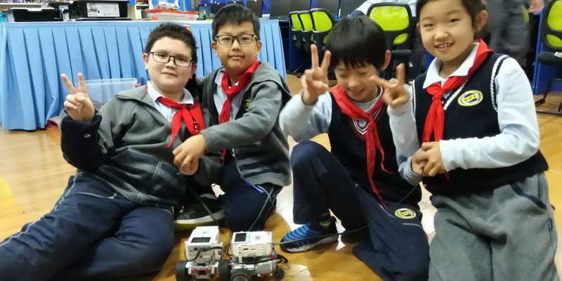 這些孩子來自世外小學雙語部的機器人社團,是從三年級新招收的零基礎的學生,每周一次的學習時間雖然短暫,但孩子們已經被編程機器人深深的吸引住了。孩子是天生的學習者,同時也是天生愛玩的,在"玩"的過程中,孩子們探索、體會屬于他們的世界,掌握更多的知識,充滿了滿足感和自信心,即使比賽失敗還是笑容滿面。