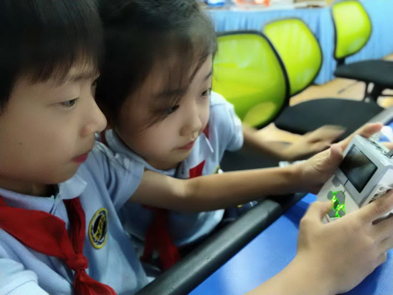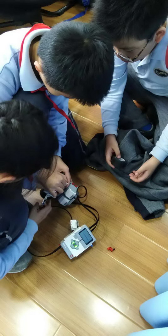 搭建完了機器人只是第一步,還得用編程將它驅動起來,這節課上,孩子們在老師的指導下學習了觸碰傳感器的使用方法,同時學習了程序中"等待"和"分支"的邏輯。一開始的編程對這些從未接觸過編程的孩子們來說非常燒腦,編寫完的程序看起來是正確的,但輸入小車后卻絲毫不起作用。不過,孩子們可從不氣餒,你看,我們的小隊成員可是攻克難關的高手,雖然每個小隊只有兩個人,但他們親密無間、互相幫助,共同學習,通過一遍又一遍的試錯、糾錯,終于可以用手中的觸碰傳感器來控制機器人的前進和停止了。