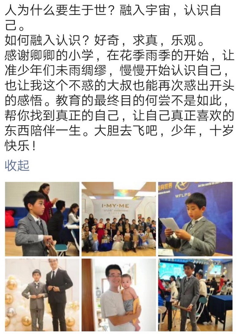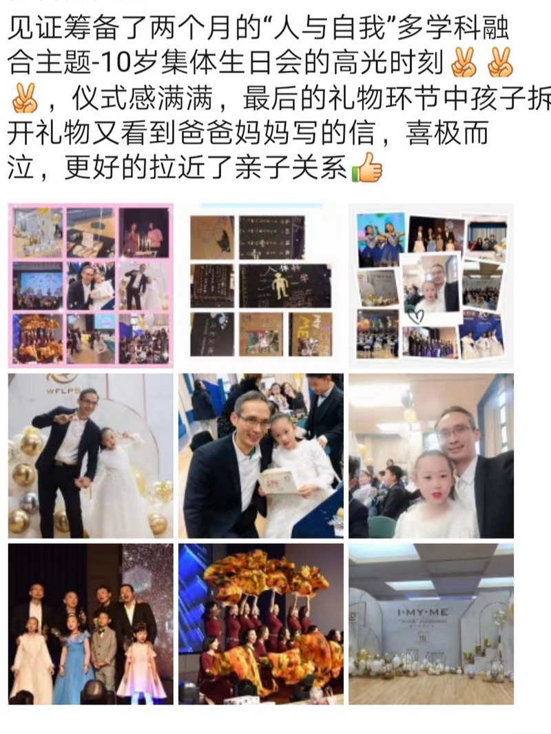 生日會上,共同回憶了孩子們三年來在WFL的點滴進步,共同見證了孩子們在主題式探究活動中的成長!三年級爸爸代表發言,表達了對孩子們的祝福并送上了一首《真心英雄》。