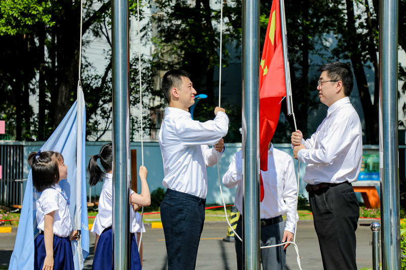國旗隊彰顯同學們的愛國情懷;鮮艷的校旗是我們世外小學的象征,是生機和活力的象征。平衡車彩旗隊隊員個個精神飽滿,斗志高昂。3位陽光爸爸和學生將國旗、校旗徐徐升起。