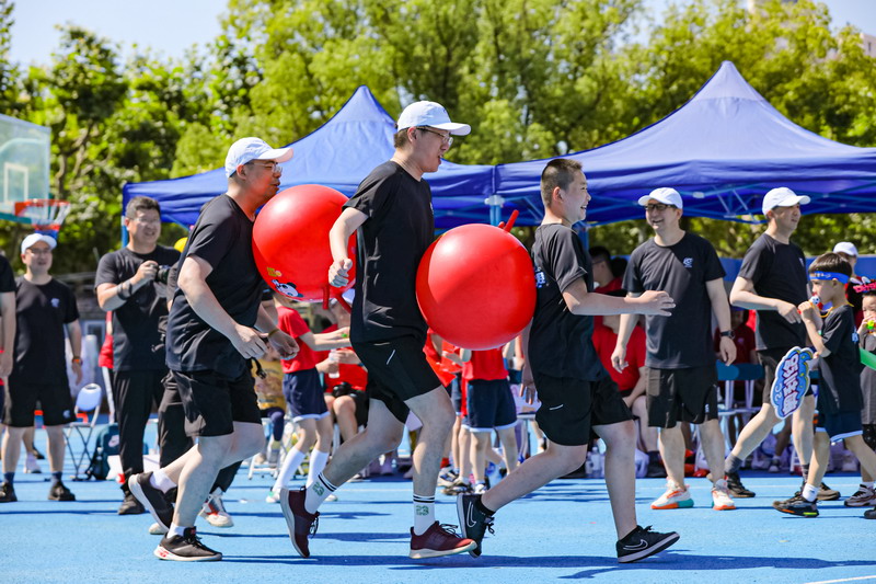 3人一組“愛的抱抱球”親子接力賽將活動的氣氛再次推向高潮。
