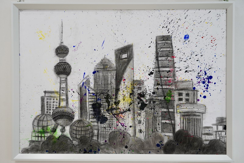 平時,我也喜歡參觀各種美術展,走出教室,身臨其境,感受藝術大師的氣息。參觀了著名藝術家蔡國強在浦東美術館舉行的“遠行與歸來”展后,我借鑒藝術家的創作方式,用爆裂噴灑的方式繪制了以東方明珠電視塔等建筑為主題的作品,以此來慶祝中國共產黨成立100周年。