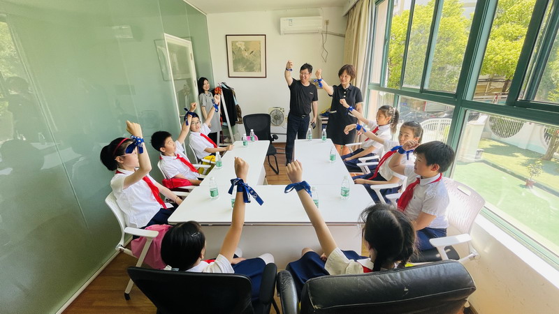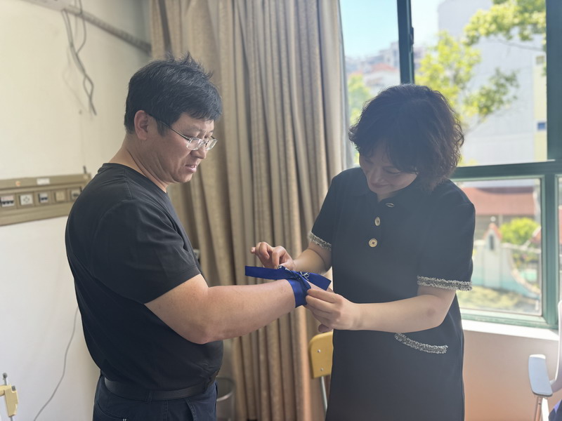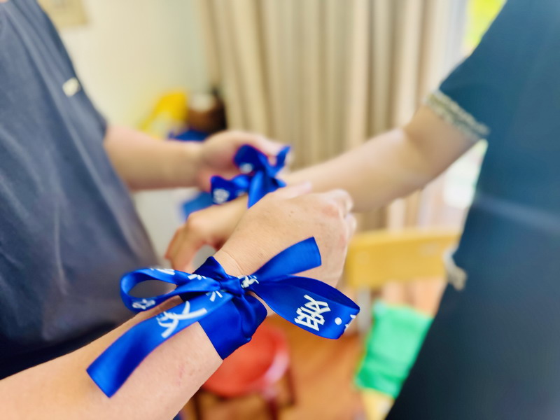 最后,同學們相聚會議室,和老師一起系上藍絲帶,共同承諾——“愛,讓星空藍起來”!