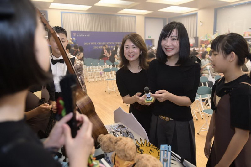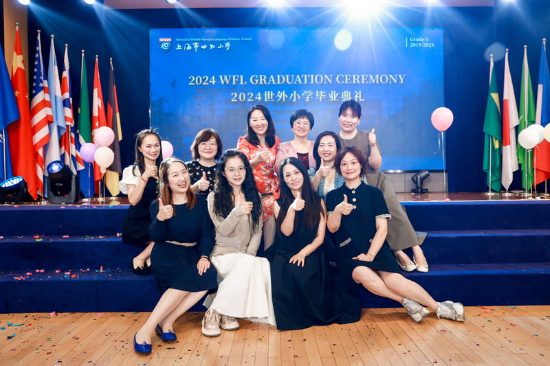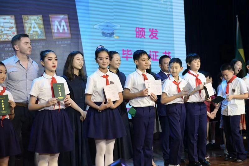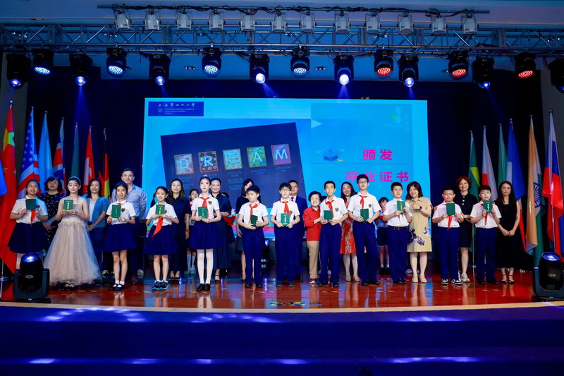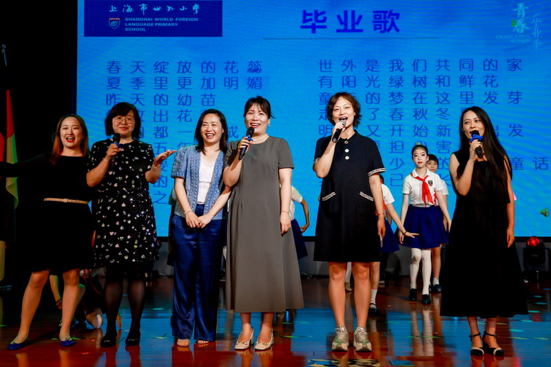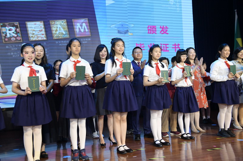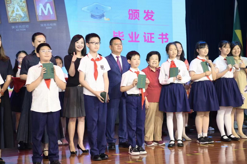 世外小學(xué)理事長(zhǎng)王均金先生,理事王小平、葉進(jìn)琦、王妍人女士,張悅穎校長(zhǎng)、陸素英副校長(zhǎng)和畢業(yè)班班主任們?yōu)槿w同學(xué)頒發(fā)畢業(yè)證書(shū)。