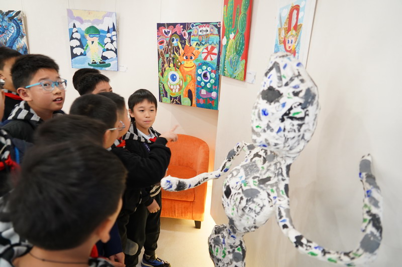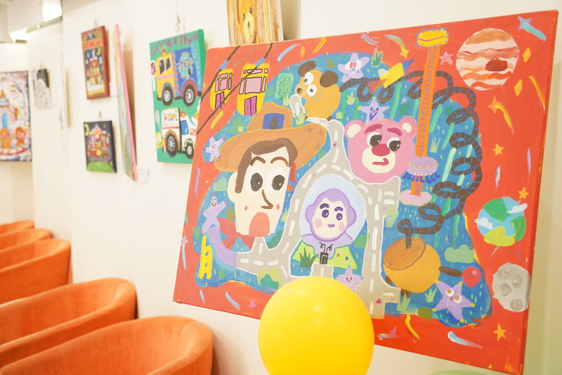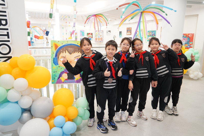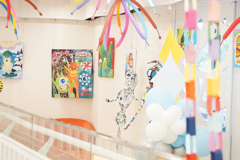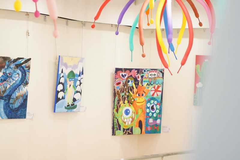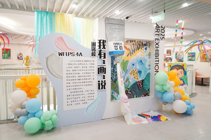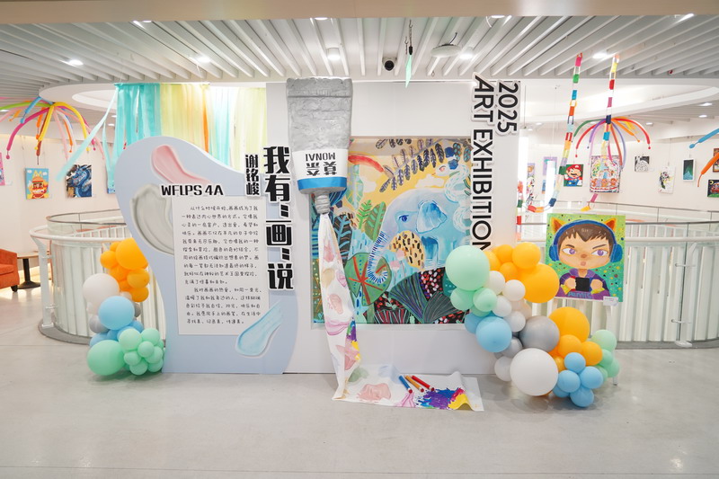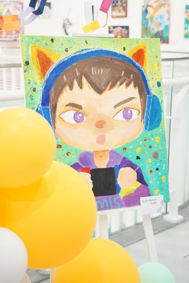 整個畫展的布置同樣亮眼,色彩斑斕的氣球、趣味十足的裝飾,讓展廳宛如童話世界般夢幻。同學們紛紛駐足欣賞,被這些富有童真和活力的畫作吸引,感受到了小謝筆下的溫暖與快樂。