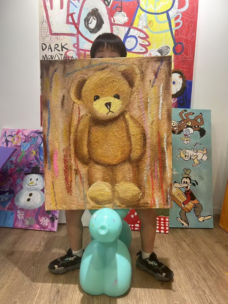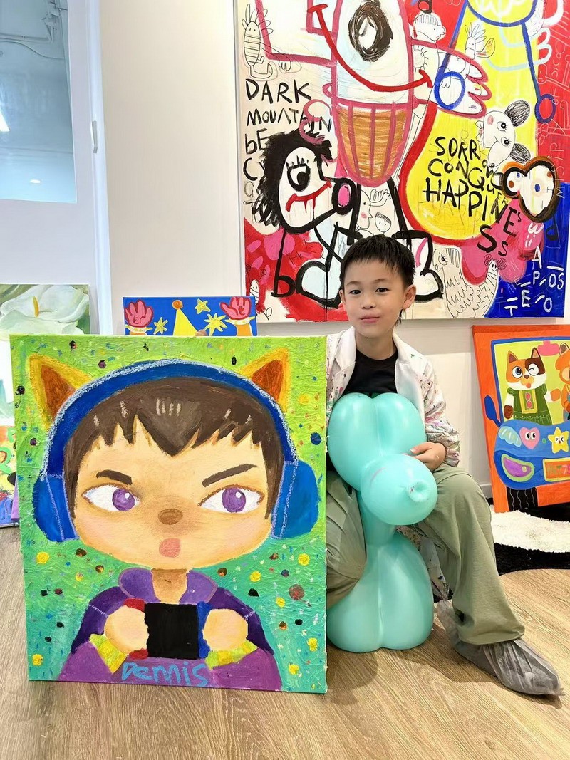 這次畫展,小謝帶來了許多充滿童趣、色彩繽紛的作品。從戴著貓耳機、沉浸在幻想世界中的少年,到充滿歡樂的玩具世界,還有那略帶神秘氣息的動物王國……每一幅作品都流淌著他對生活的熱愛和獨特的想象力。他用色彩講述自己的故事,用畫筆捕捉生活中的點滴美好。