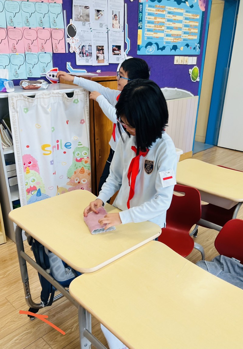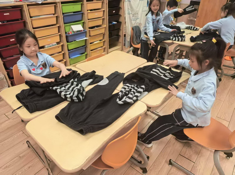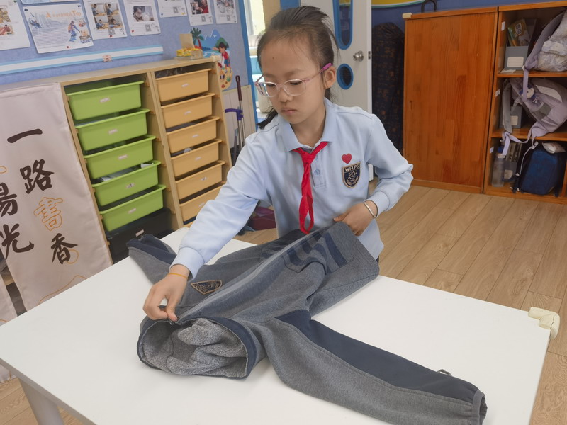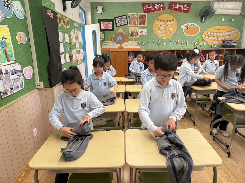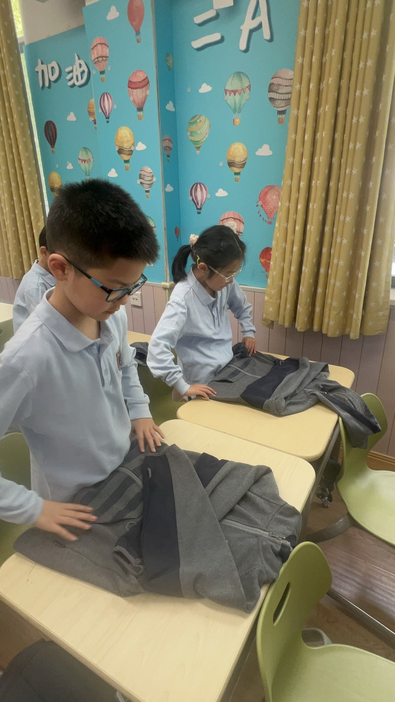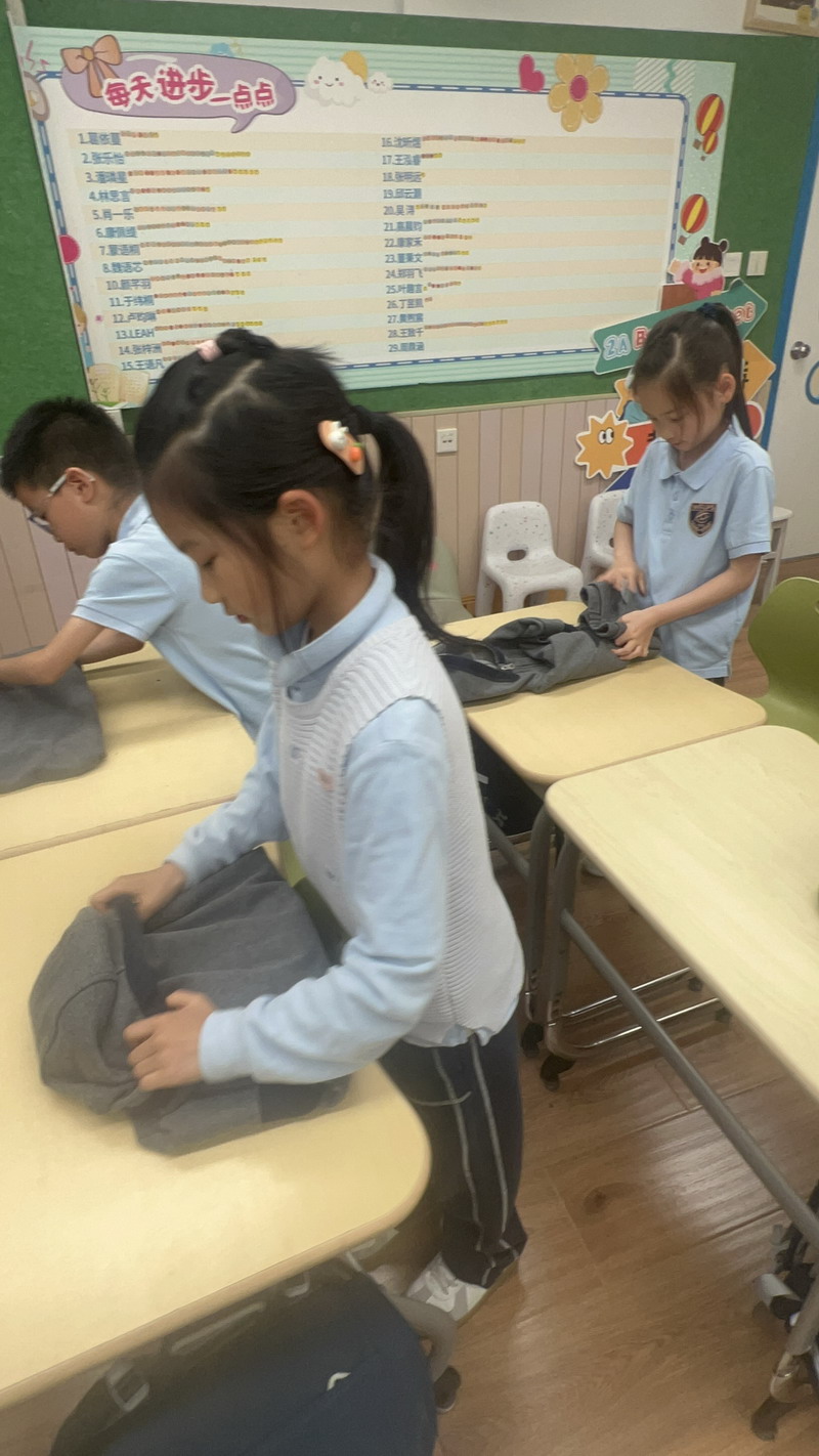 四年級的同學(xué)們迎來了一場“深度清潔挑戰(zhàn)”。他們分工合作,有的用長柄刷清理風(fēng)扇葉片,有的蹲身擦拭墻邊瓷磚,還有的將教室綠植的枯葉細(xì)心修剪。疊正裝校服環(huán)節(jié),孩子們將衣領(lǐng)袖口撫平,疊出棱角分明的“豆腐塊”??粗懊鲙變舻慕淌遥?/span>“勞動不僅是打掃衛(wèi)生,更是為集體貢獻(xiàn)力量的自豪感。”