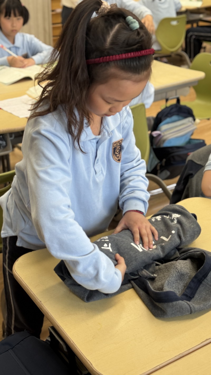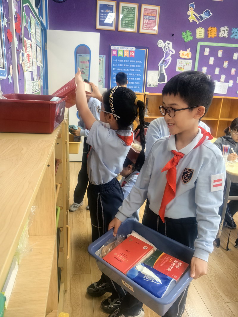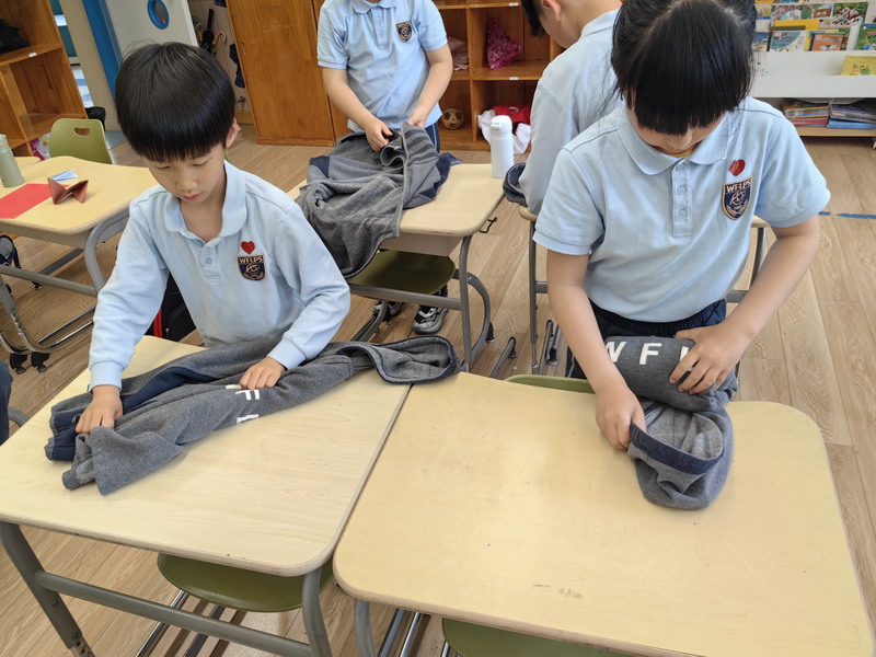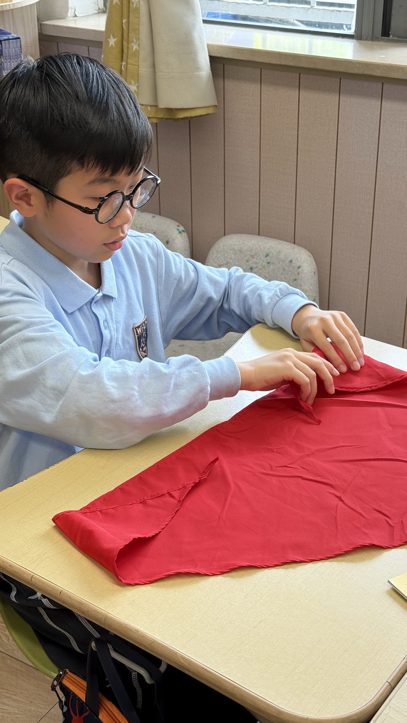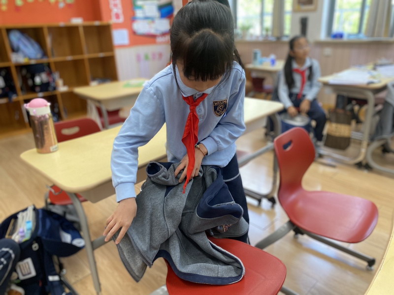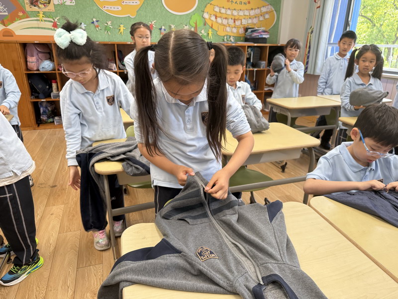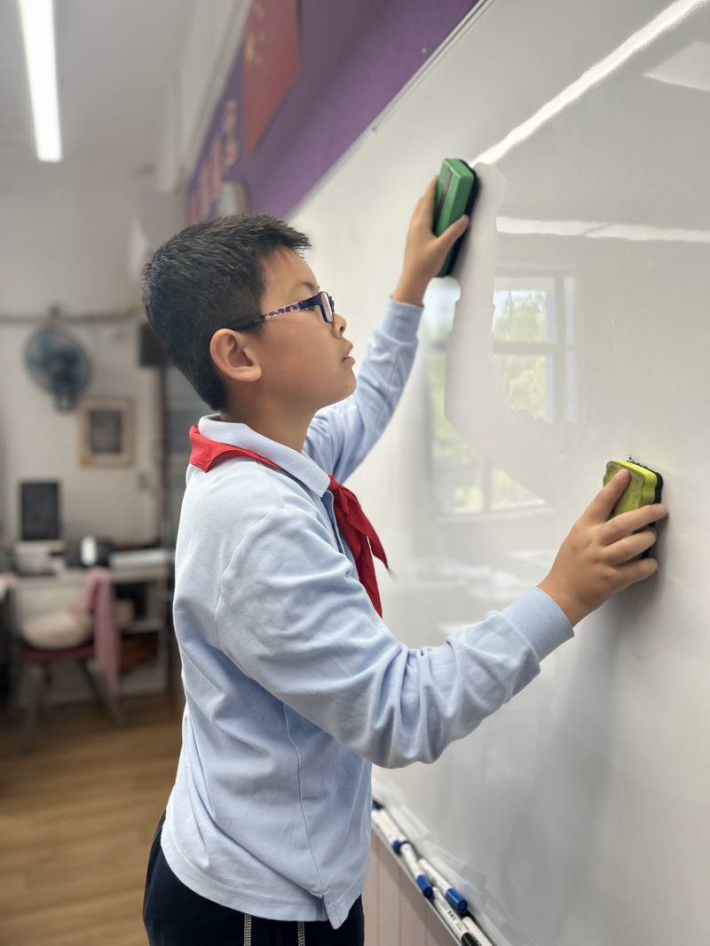 四年級的同學(xué)們迎來了一場“深度清潔挑戰(zhàn)”。他們分工合作,有的用長柄刷清理風(fēng)扇葉片,有的蹲身擦拭墻邊瓷磚,還有的將教室綠植的枯葉細(xì)心修剪。疊正裝校服環(huán)節(jié),孩子們將衣領(lǐng)袖口撫平,疊出棱角分明的“豆腐塊”??粗懊鲙變舻慕淌遥?/span>“勞動不僅是打掃衛(wèi)生,更是為集體貢獻(xiàn)力量的自豪感。”
