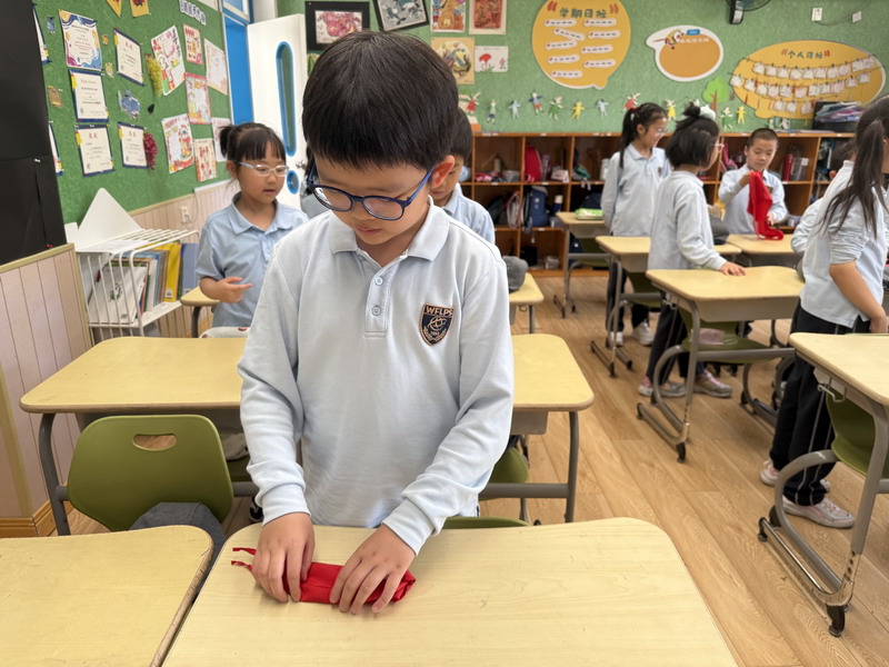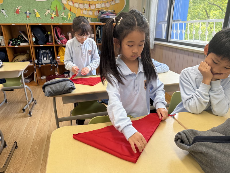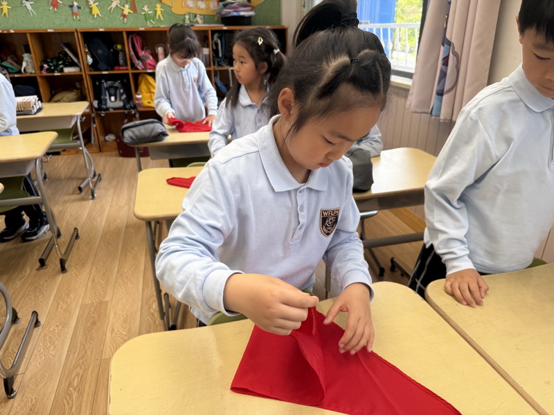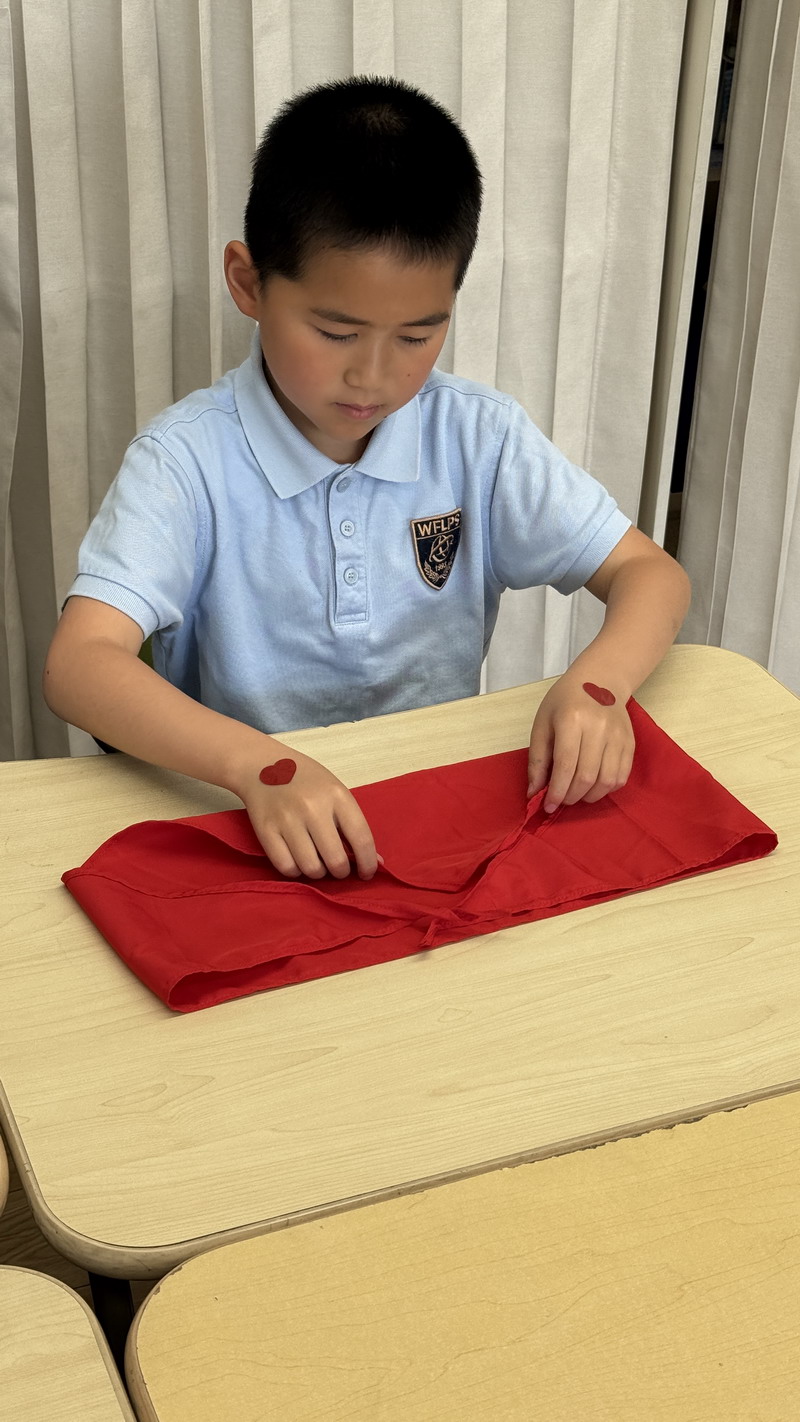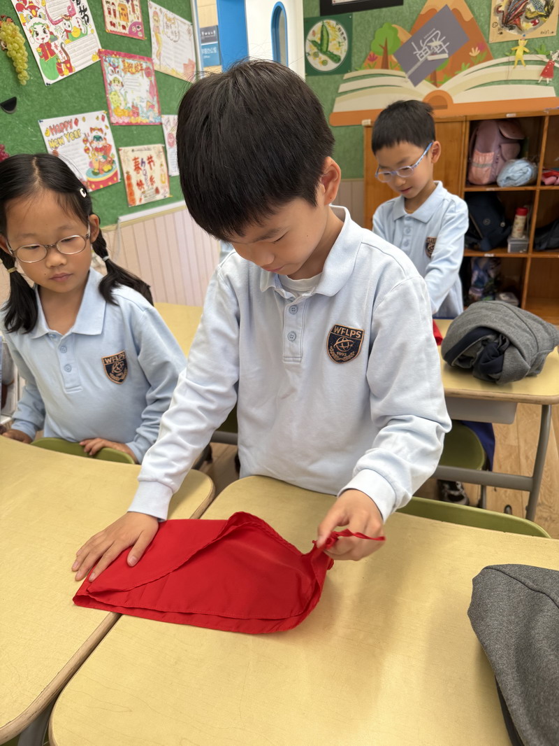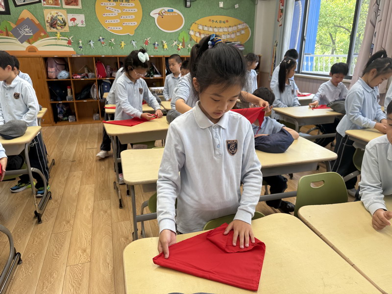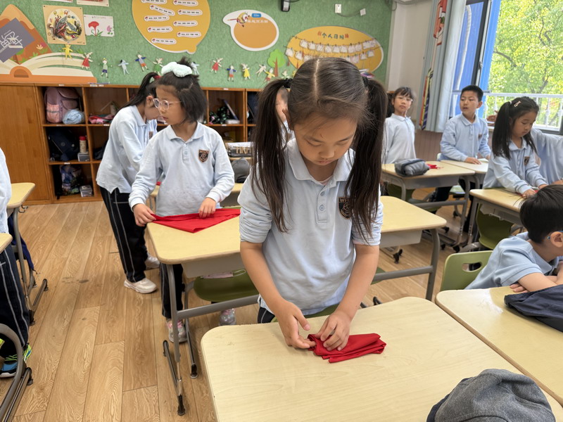 二年級的同學(xué)們將勞動與少先隊(duì)禮儀結(jié)合,開展了“紅領(lǐng)巾的儀式感”主題活動。他們不僅掌握了快速系鞋帶的技巧,還通過視頻學(xué)習(xí)、同伴互評,規(guī)范了紅領(lǐng)巾的折疊與佩戴方式。疊灰鼠校服時,孩子們細(xì)致對齊每一處褶皺,將“整齊”二字融入日常習(xí)慣。班主任老師表示:“折疊紅領(lǐng)巾看似簡單,卻能培養(yǎng)孩子對細(xì)節(jié)的重視和對少先隊(duì)員身份的認(rèn)同。”