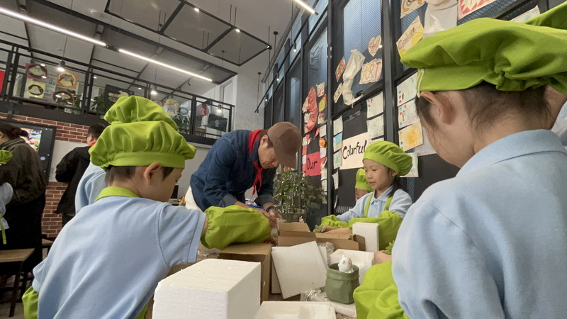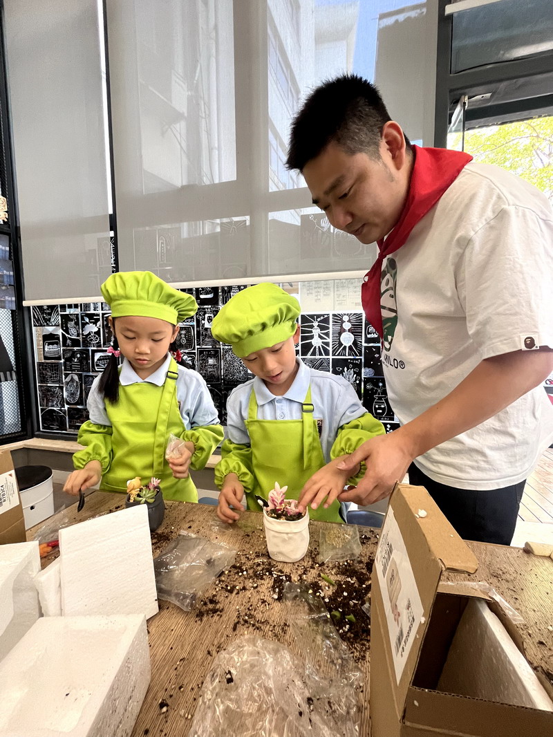 爸爸們的“勞動魔法秀” 園丁爸爸帶著孩子們,教他們怎么種花。孩子們拿著小鏟子,跟著爸爸一起種植、澆水。園丁爸爸一邊示范,一邊講解:“種多肉可不能馬虎哦,陽光和水分都要恰當,很小心。”孩子們聽得津津有味,小手也一刻沒停,一盆盆漂亮的花兒在他們的努力下“安家落戶”。