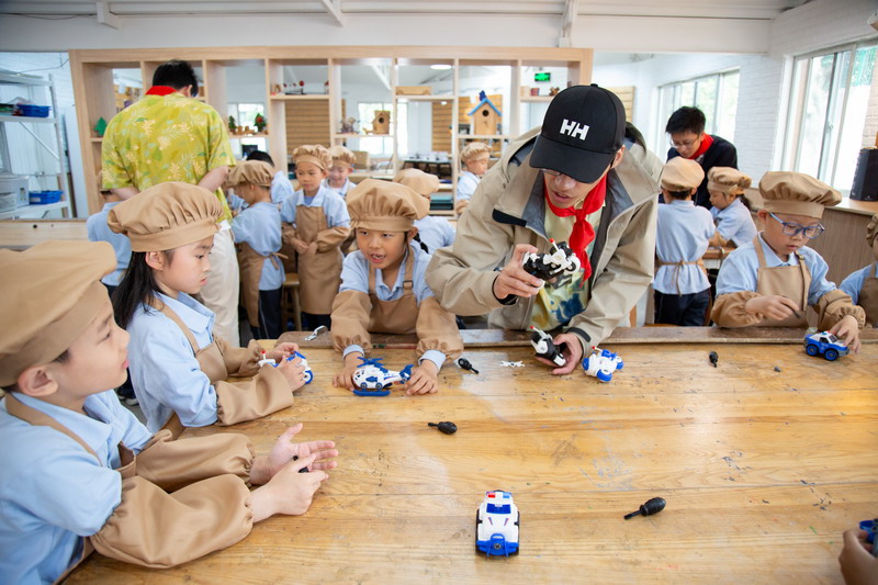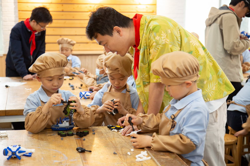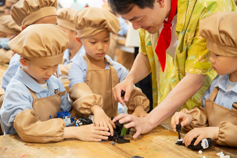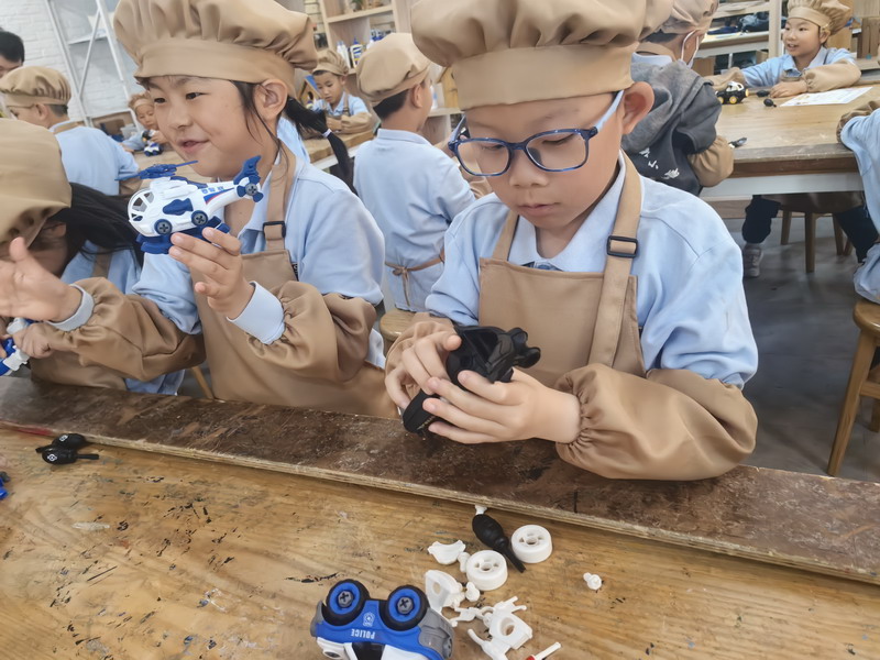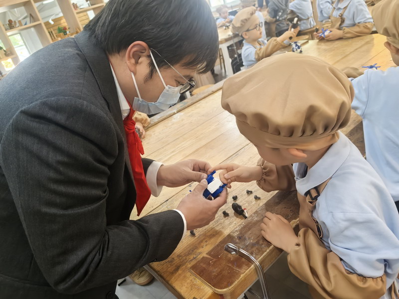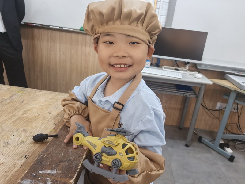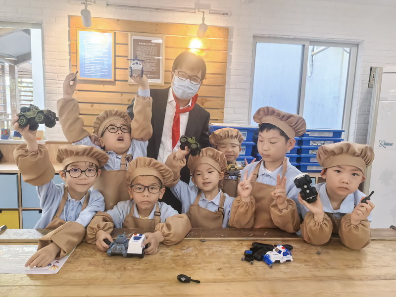 工程師爸爸、DT爸爸帶著孩子們來到 DT 教室、科學教室,給他們介紹神奇的勞動工具。孩子們的眼睛都亮了,這些平時看起來普通的工具,在爸爸的手里就像變魔術一樣。爸爸們準備充分,用專業的知識樸實的言語一邊講解電的原理,工具的使用方法,一邊提醒孩子們要注意安全。孩子們迫不及待地動手操作起來,一個個小汽車、小飛機被組裝完成,一盞盞小燈泡被亮起,孩子們臉上的笑容,那份成就感油然而生,今天,一個個都成了“小小工程師”。