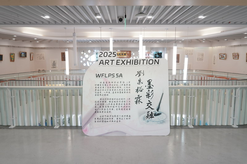 初夏的校園,綠意正濃,陽光灑滿走廊與書頁,也悄悄點亮了藝術空間。在這片洋溢著創意與靈感的展區里,五A班劉朱裕霖同學的“墨彩交融”主題畫展嶄新揭幕。墨之沉靜,彩之斑斕,書法與繪畫在這里相遇、交融,構成一幅幅富有生命力與思想溫度的藝術篇章。