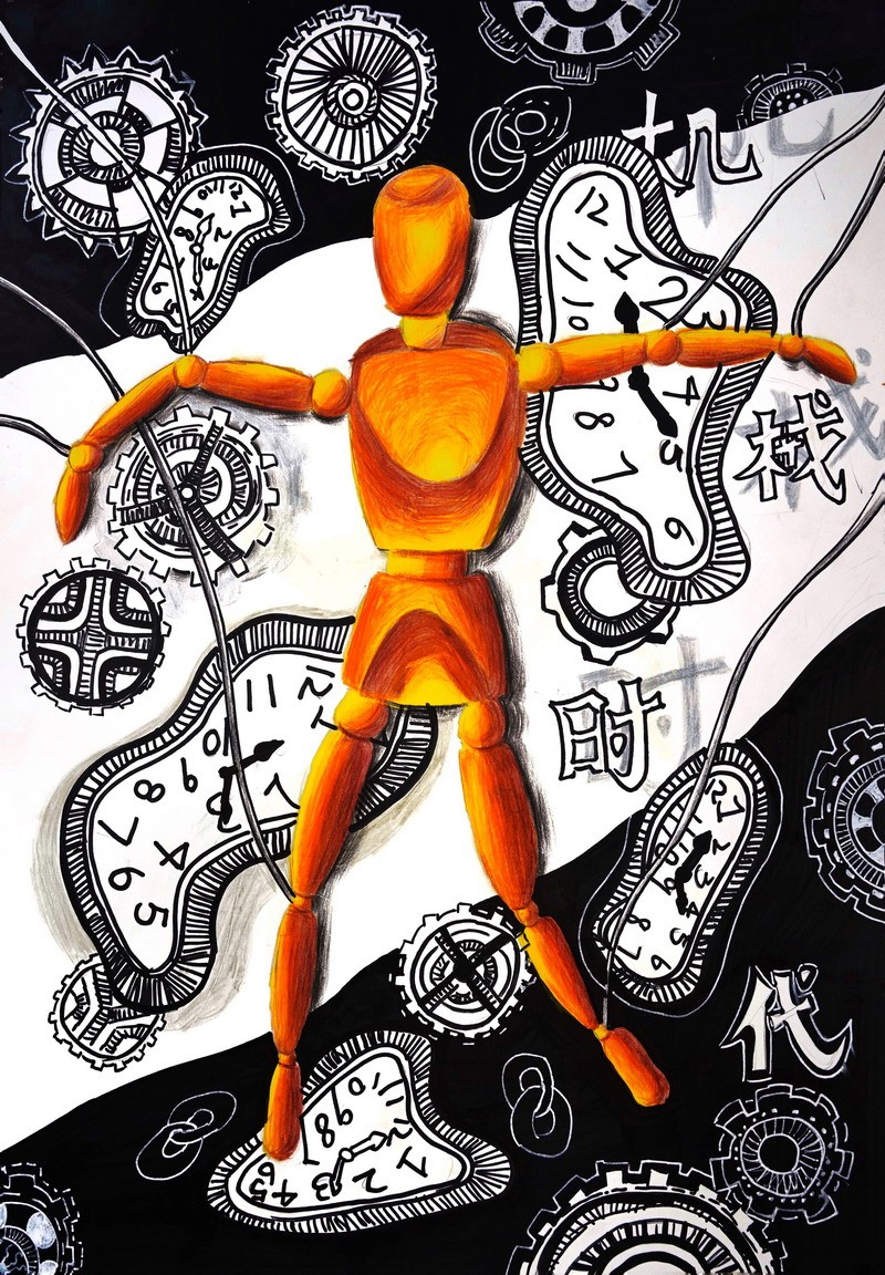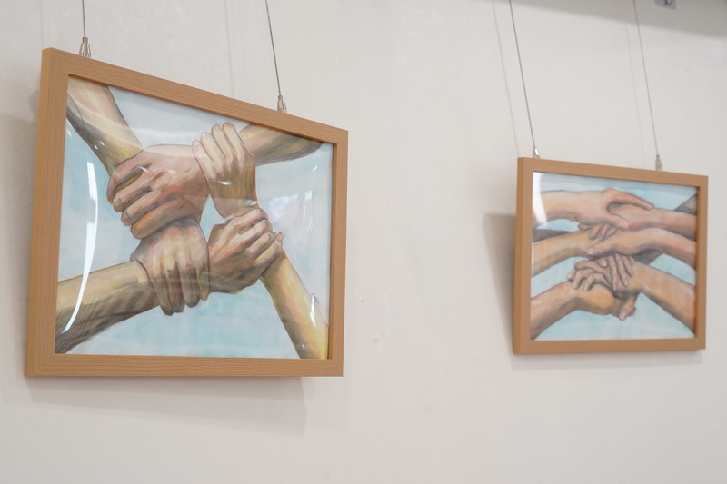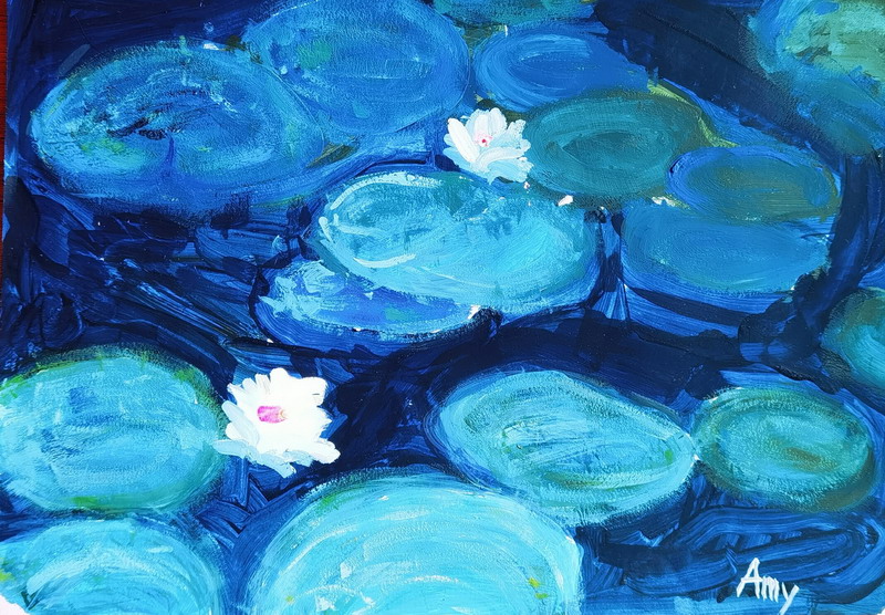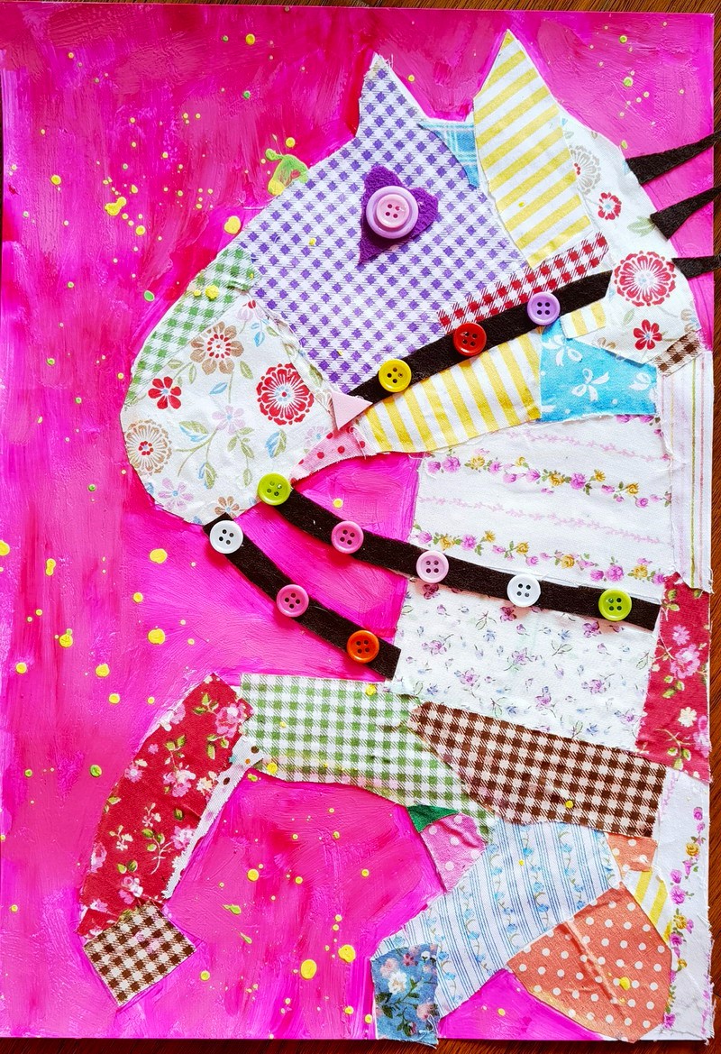 繪畫是場神奇的冒險。從2歲時在墻上畫出第一道“彩虹”,劉朱裕霖便開啟了與色彩相伴的旅程。展覽中的拼貼作品《斑斕小馬》靈動歡快,鈕扣、布料與繪畫顏料交織,構建出一個童趣盎然的幻想世界。水粉荷花的溫潤、丙烯拼貼的張揚,交替呈現出她在技法與表達上的不斷嘗試。從色彩暈染到炭筆定格,每一次嘗試,都是一次心靈的遠行。
