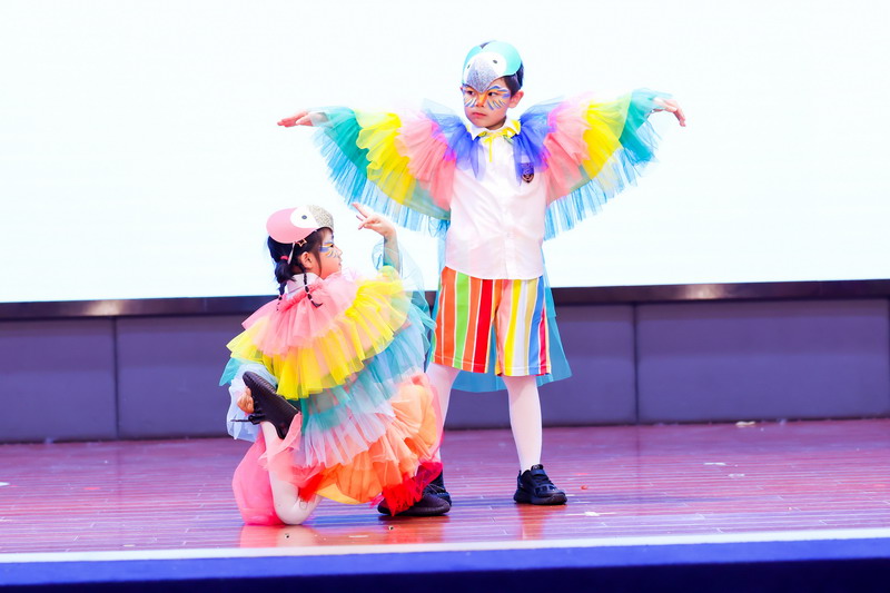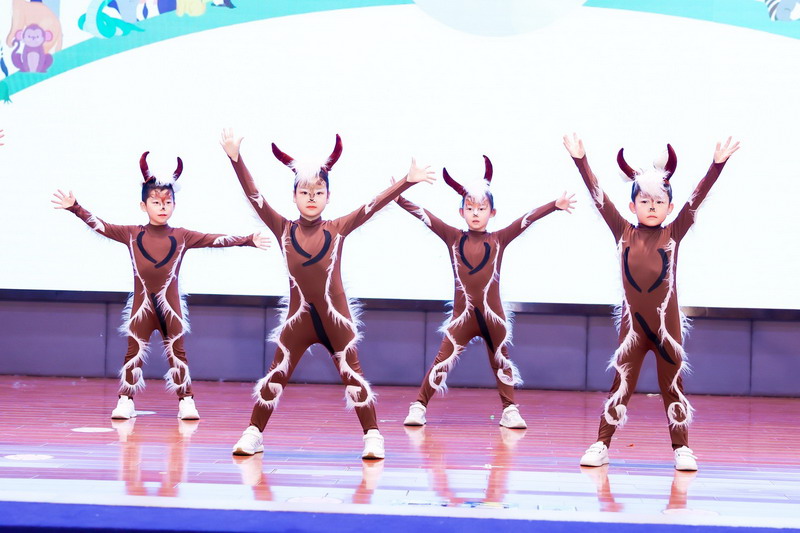一A班的同學(xué)來啦!他們化身為熱帶雨林的鸚鵡、老虎、青蛙、蜘蛛,用舞蹈展示熱帶雨林動物的風(fēng)采!