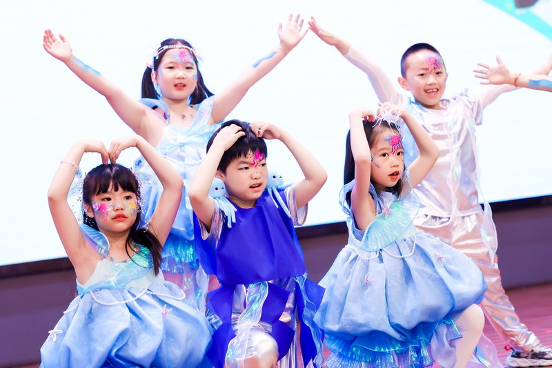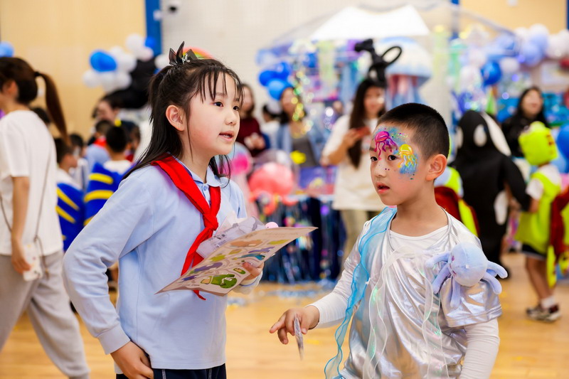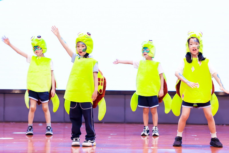 一C班的同學(xué)來啦!他們化身為海龜、水母、虎鯨和貝殼,一起暢游神奇的海洋世界。