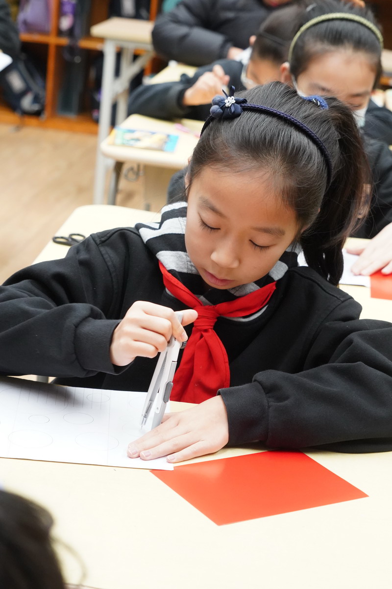 在創作開始前,孩子們先在數學課堂中系統認識“圓”——從圓心、半徑、直徑等基本概念出發,理解圓的結構與特征,并探究圓在生活中的廣泛應用。在此基礎上,學生用親手制作的圓規嘗試畫圓,在嘗試中體會“精準”與“變化”的關系,讓抽象的數學知識轉化為可感、可用的實踐經驗。