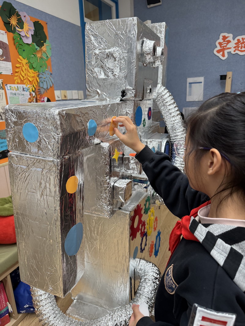 機身布滿不同大小、不同材質的圓形貼片;金屬質感與彩色圓點形成強烈對比;冷冰冰的“機器人”被孩子們一點點貼出溫度與童趣。