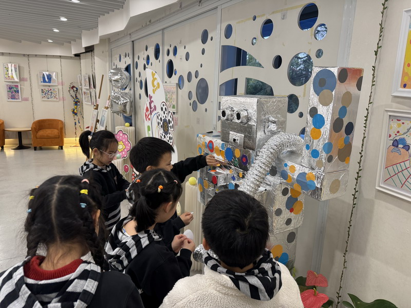 除了平面繪畫,孩子們還將“圓”的元素延伸到立體創作中。展區中最吸引目光的,是由學生參與裝飾完成的大型機器人藝術裝置。