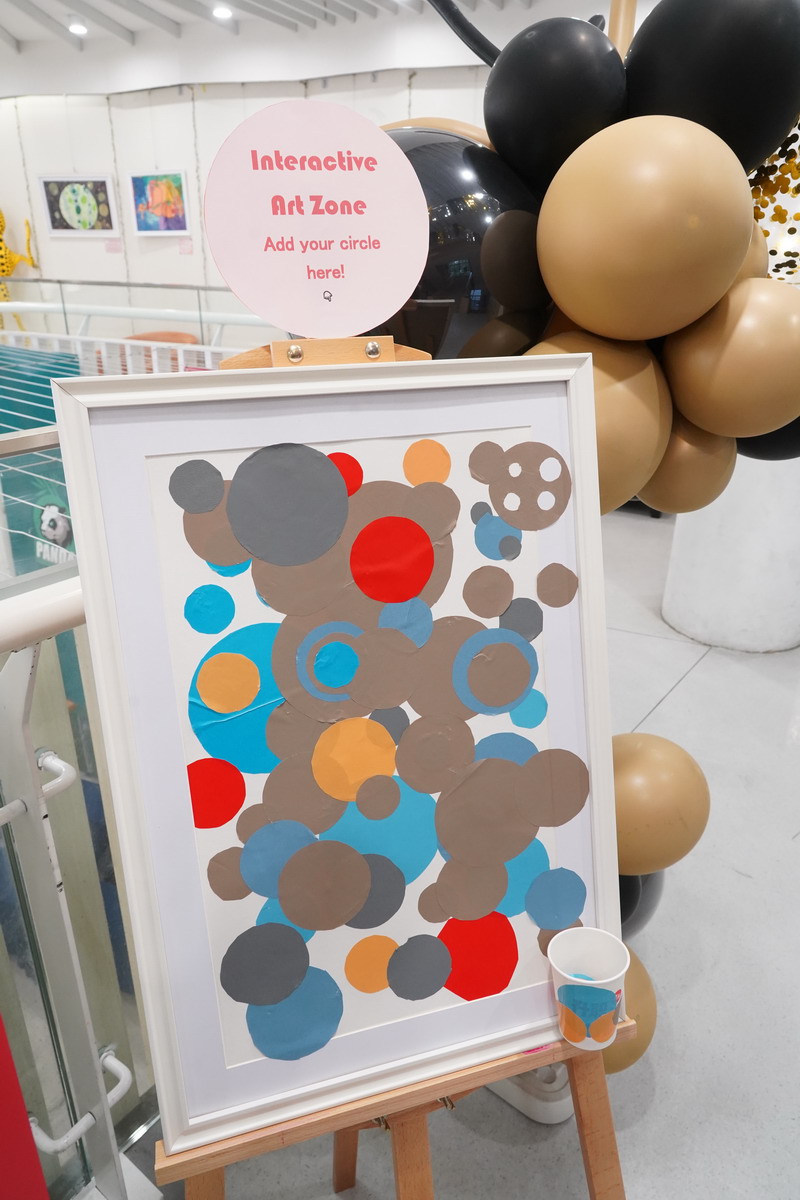 本次藝術展特別設置了“互動創作區”。在這里,孩子們可以用畫筆畫圓、用彩紙剪圓、用各種材料制作圓形貼片,然后走進展區,將自己的“圓”貼到空白畫框上。