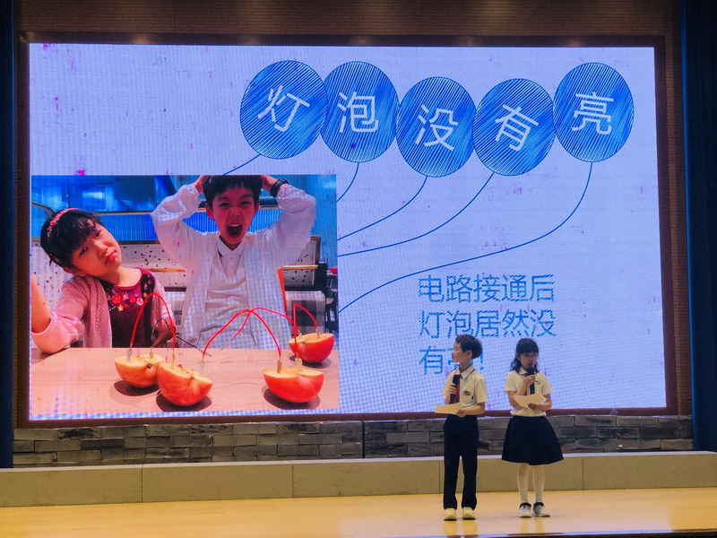 三(1)班的張尊凱和孟和曦兩位小朋友研究的課題是“哪些水果可以發(fā)電?”。在課題的研究過(guò)程中,兩位小朋友不僅選取了多種水果進(jìn)行點(diǎn)亮燈泡的可行性研究,還對(duì)不同水果對(duì)燈泡的亮度影響進(jìn)行了研究。在之后的分享過(guò)程中,兩位小朋友就自己在實(shí)驗(yàn)過(guò)程中遇到的失敗,和從失敗中得到的啟發(fā)與全體三年級(jí)學(xué)生進(jìn)行了交流,相信他們的分享會(huì)給其他小朋友在接下來(lái)的科學(xué)探究過(guò)程中給與一定的啟發(fā)和幫助。
