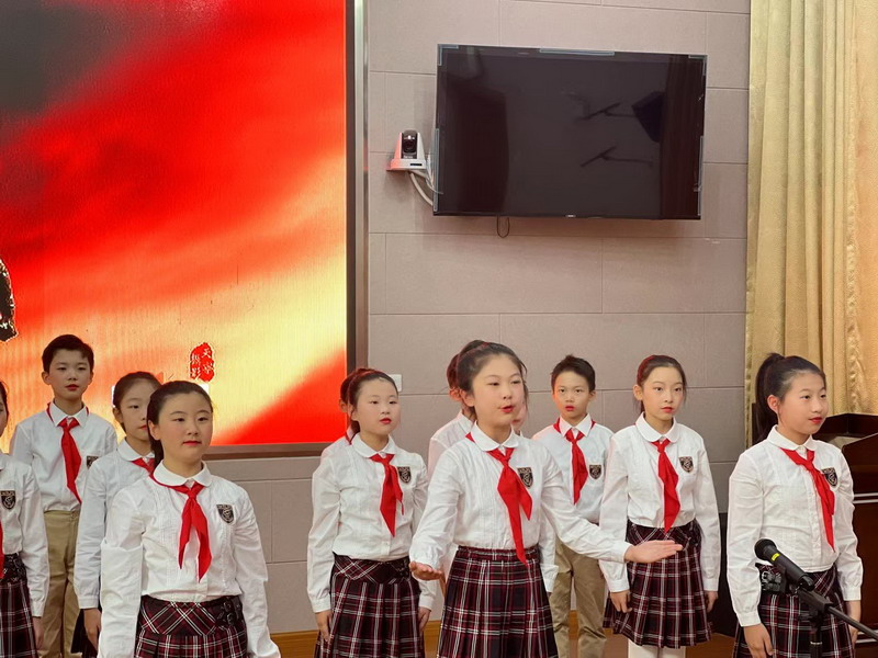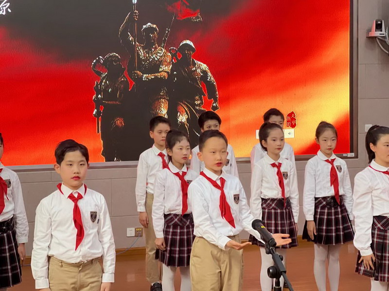 毛澤東詩詞是中國詩林中矗立的一株參天大樹,是一部中國革命的壯麗史詩。四年級的少先隊員們則聲情并茂地朗誦出《卜算子·詠梅》《沁園春·雪》《沁園春·長沙》三首毛澤東的經典詩詞,用他們鏗鏘有力的聲音帶領大家再次感受老一輩無產階級革命家自強不息、樂觀豪邁的革命精神。