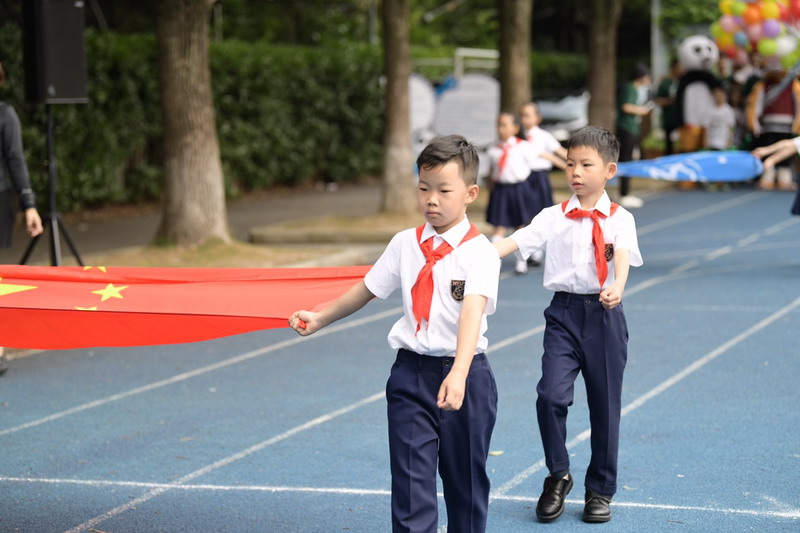 瞧,走在隊伍最前面的,是國旗護衛隊,表示同學們將祖國放在第一位,立志要為祖國爭光,為國旗添彩。緊跟在國旗隊伍身后的,是世外小學校旗方隊。藍白相間的校旗,是世外小學的象征,更是生機和活力的象征。
