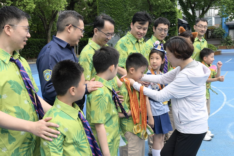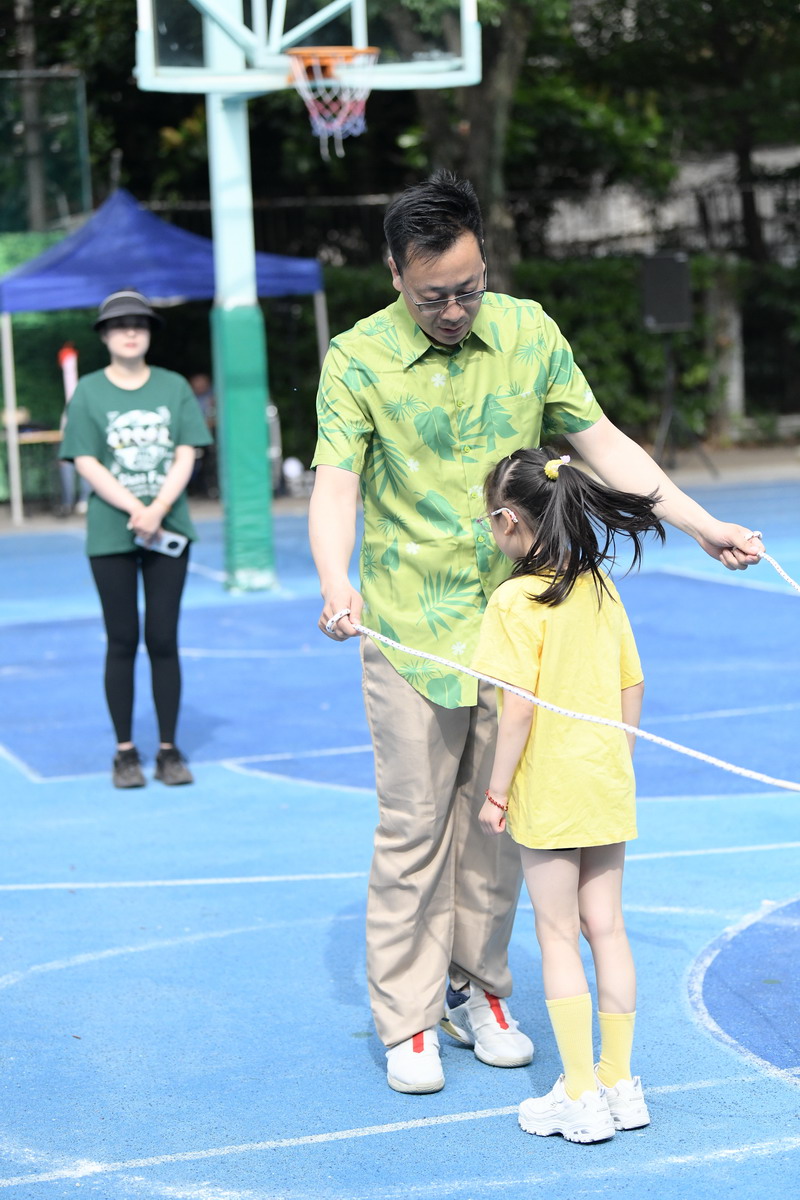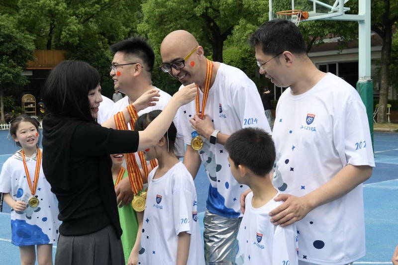 比賽結束,張校長和閔校長為各項目的冠軍爸爸和孩子進行頒獎。