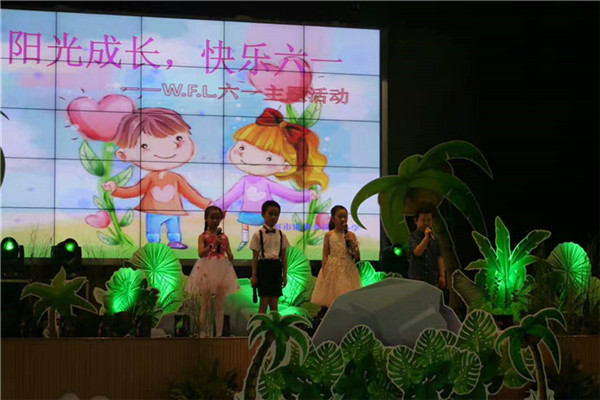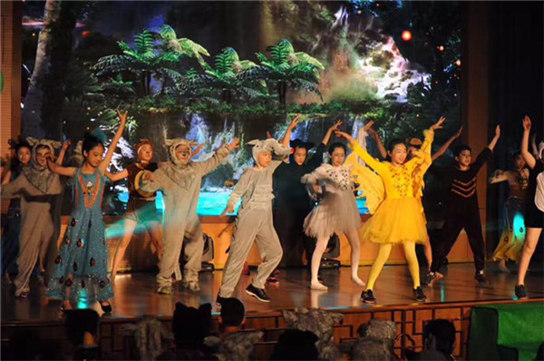為了配合六一的活動,五年級之前舉行了畢業大戲《魔幻森林》的展演,將舞臺打造成立體的魔幻效果,孩子們身著戲服進行全英文的演出,取得了震撼的效果。