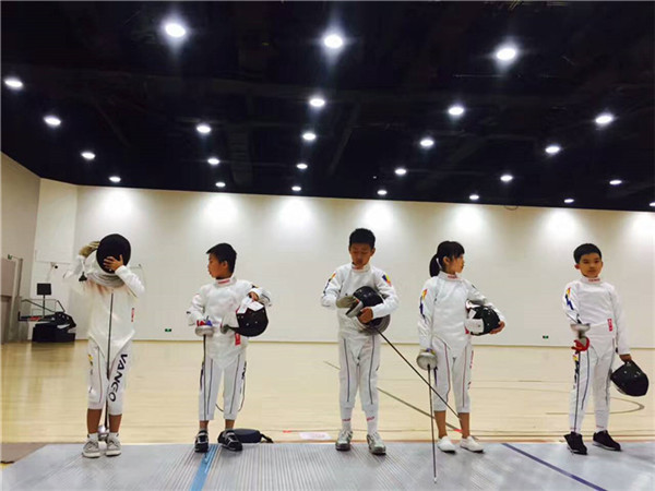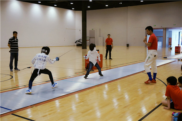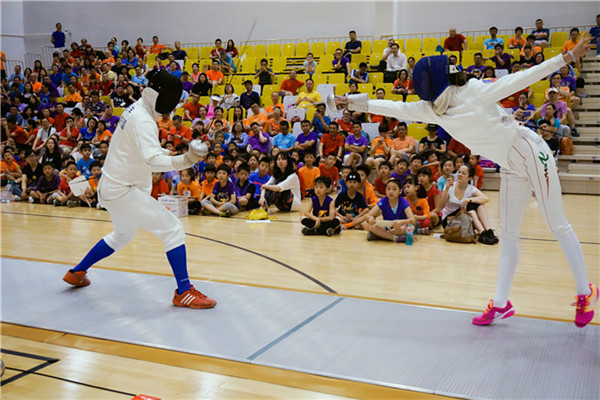 游戲環節之后進行了擊劍比賽。擊劍是從古代劍術決斗中發展起來的一項體育項目,它結合優雅的動作和靈活的戰術,要求運動員精神的高度集中和身體的良好協調性,體現出運動員良好的動作和敏捷的反應。運動員穿戴擊劍服裝和護具,在擊劍場上以一手持劍互相刺擊,被先擊中身體有效部位的一方,為被擊中一劍。