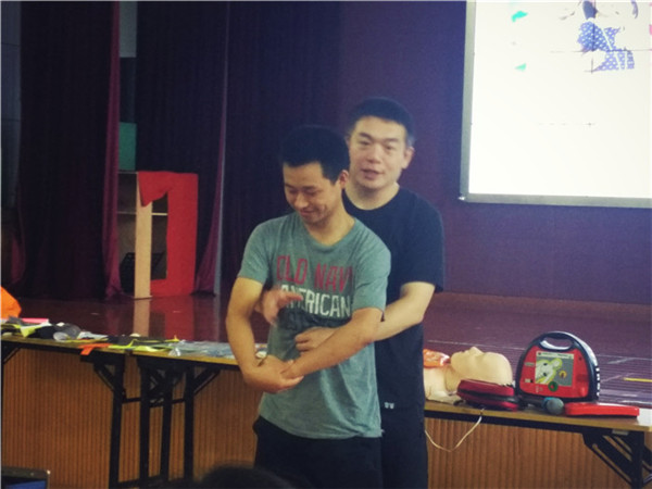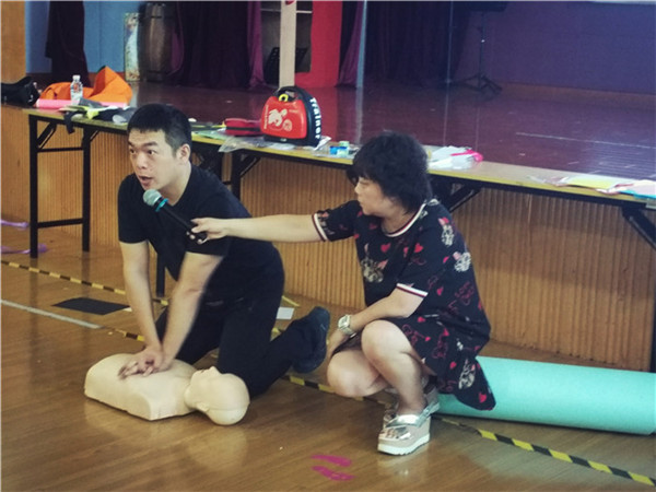 一番講課過后,翟教官要求每位老師親自體驗急救中的"心肺復蘇",因為只有通過實際的模擬操作,才能完整地學到急救方面的知識。每位老師上臺體驗,翟教官耐心地指導大家的手勢和用力程度以及時間。