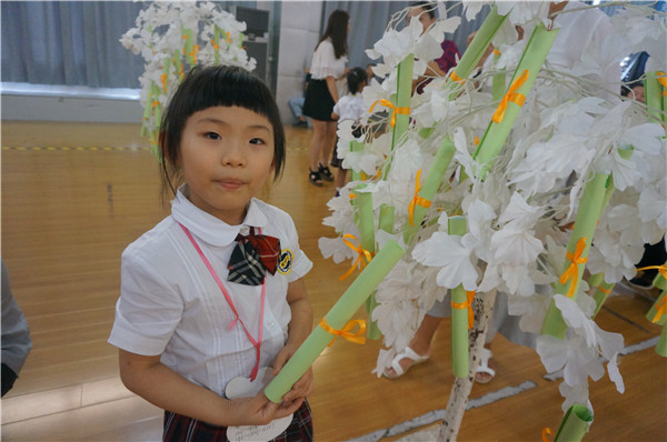 在入學儀式上,世外小學校長張悅穎、常務副校長陸素英向全體新生致辭,歡迎他們來到世外大家庭。班級代表上臺從校長手中接過一盆花,他們將會把這盆花放在每個班級的教室中,和美麗的盆花一起茁壯成長。