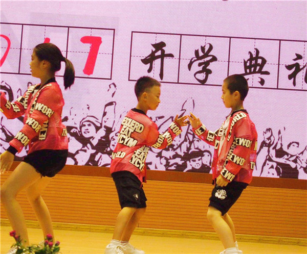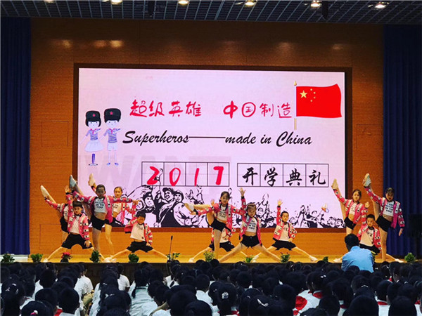 一大早,體育館內便座無虛席,孩子們昂著小腦袋等待著開學典禮的開場。一曲勁爆的啦啦操音樂拉開了典禮的序幕,世外舞蹈團的孩子們在舞臺上旋轉、跳躍,把獲得市啦啦操金獎的節目呈現在同學們面前。緊接著,大隊輔導員老師和大家親切地聊起了暑假生活,由熱點電影《戰狼2》引入了本次開學典禮的主題"超級英雄 中國制造",瞬間點燃了大家的愛國熱情。這時,趁著建軍90周年的余熱未消,同學們一起觀看了中國解放軍海陸空的英文宣傳片,對祖國的"英雄"多了一份了解和敬佩,結合世外"DREAM"的培養目標,更加理解了RISK——敢為天下先的含義。