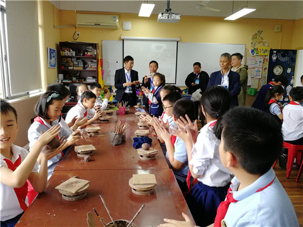 之后他們分組聆聽了雙語部李虎老師的武術課、范海龍老師的體育課、朱珠老師的語文課、朱婉清老師的英語課、黃夏老師的數(shù)學課以及王麗雯老師的美術課。參觀團的老師們對世外師生表示高度的稱贊,他們說這里的孩子們充滿陽光,不僅在語數(shù)外學習中出類拔萃,他們在藝術、體育和科技等方面的學習同樣熠熠生輝。世外小學不僅在教育教學課程上,更是在教學理念、環(huán)境布置等各個方面都讓他們開闊了眼界,值得他們學習。