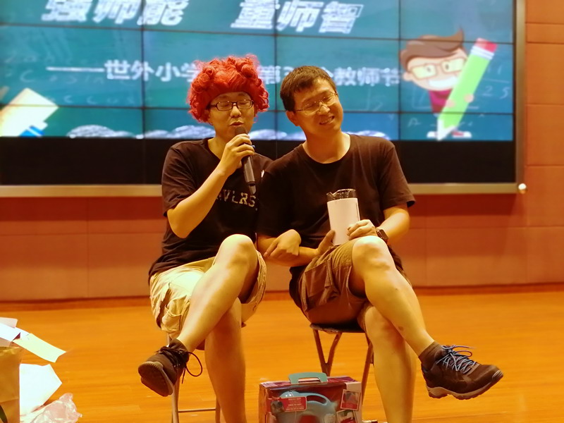 簡短而又嚴(yán)肅的儀式之后,是每年教師節(jié)的保留節(jié)目,即教師之間的禮物互換。每年教師節(jié)學(xué)校都以抽簽的形式,進(jìn)行兩位教師之間的禮物互換。禮物不在意價(jià)值,而在意的是教職工之間的凝聚力。張虹老師和林思毓老師作為每年這個(gè)環(huán)節(jié)的當(dāng)家主持人,每次都為大家?guī)須g聲笑語和溫馨氛圍。陳洪和龔豪老師在交換禮物的過程中,還上演了情景小品,小品展現(xiàn)了他們的未來生活,美好而又溫暖。可以說在兩兩禮物交換過程中,傳遞的是世外人彼此之間的濃濃溫情。