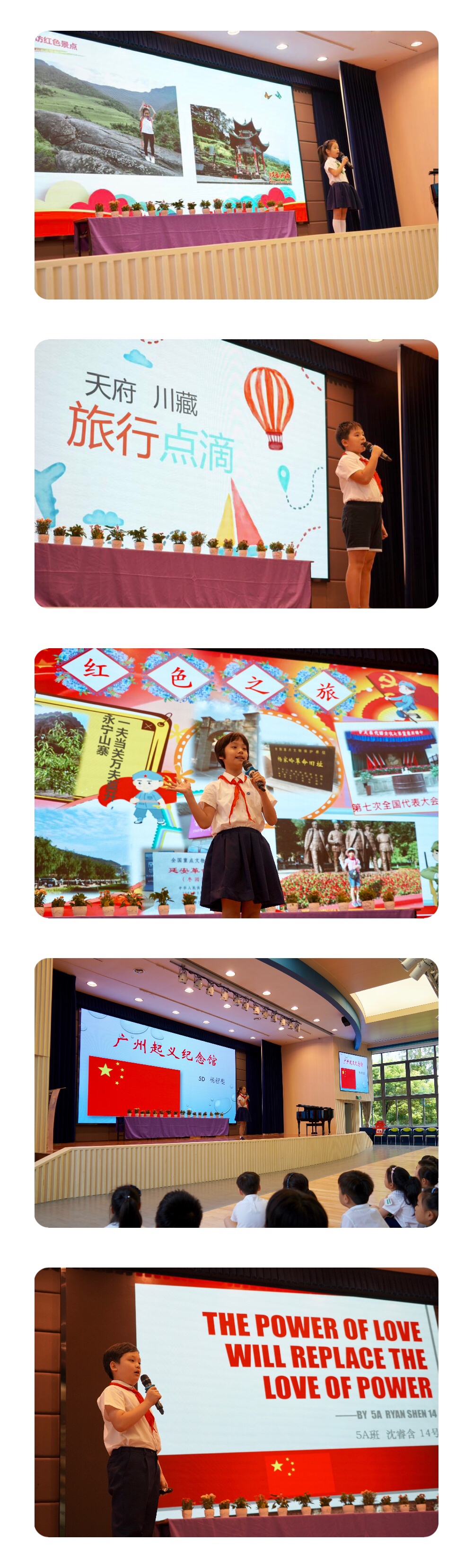 二年級的周辰碩、 三年級王珩弋 、四年級清陽佳麗、 五年級楊程斐和沈睿含為大家講述著那些紅色的回憶。最后,沈家昕一首優美的《絨花》將這部分推向了高潮。
