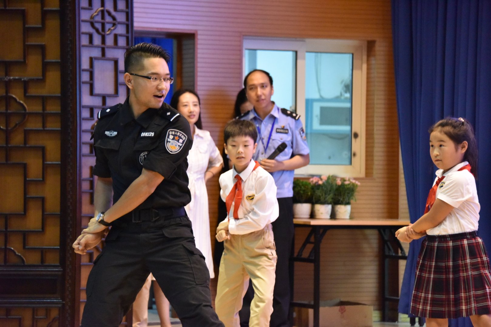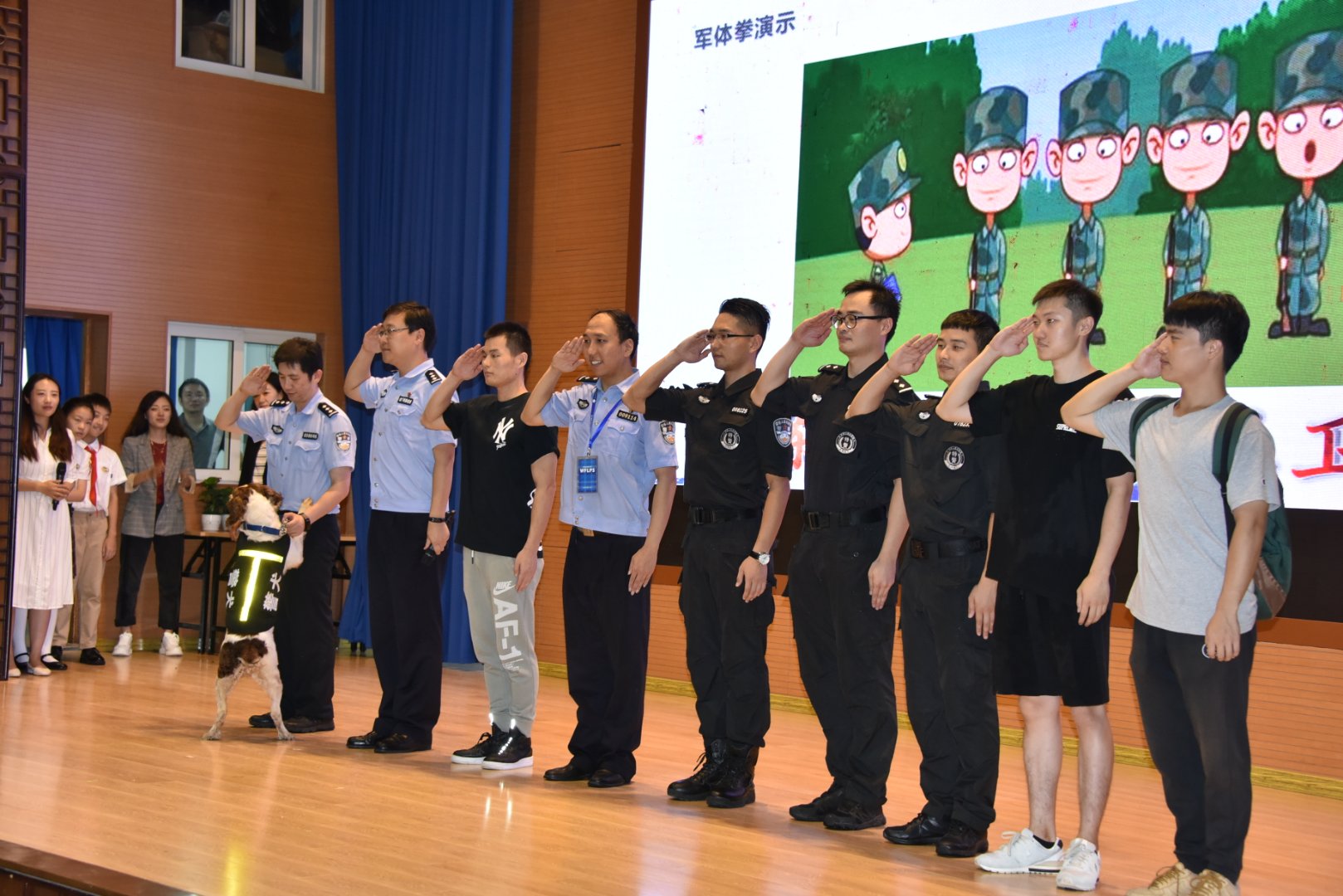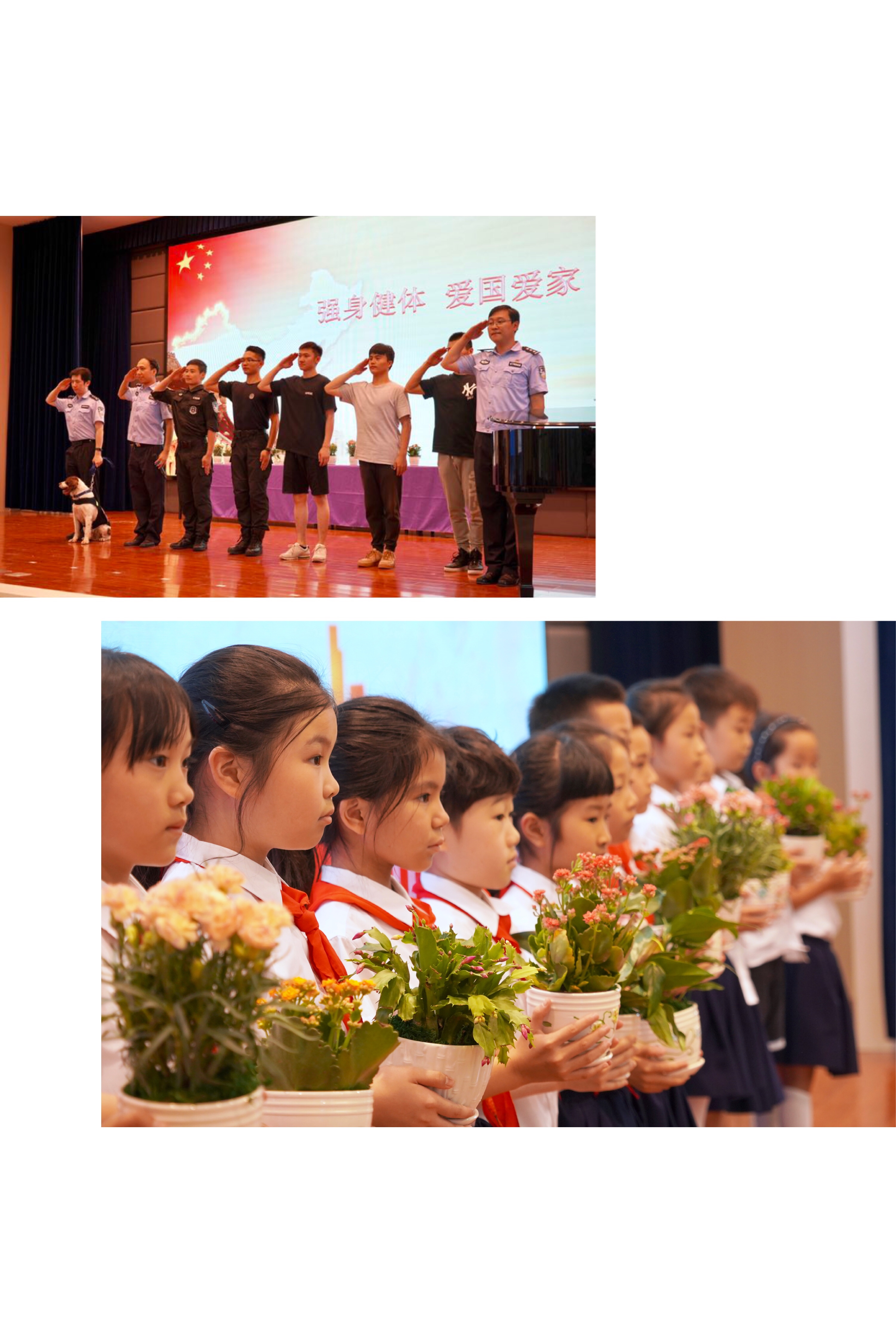 特警叔叔還邀請了學生代表上臺展示“軍體拳”,告訴他們“要強身健體才能保家衛國”。