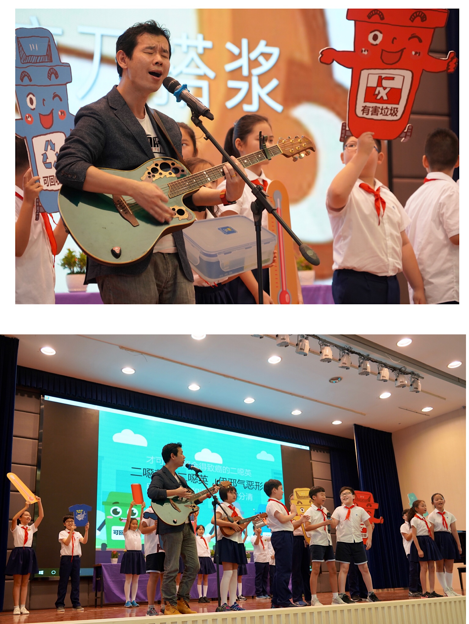 自從2019年7月1日上海實行垃圾分類之后,這個垃圾,到底該哪能倒呢?雙語部五年級李欣霖和她的同學們用特別的方式帶來了精彩表演,與滬上知名音樂唱作人、歌曲《垃圾分類再倒垃圾》創作人王淵超一同演繹,歌曲朗朗上口,歌詞里還結合了不少知識點,比如廢玻璃、金屬塑料廢紙、衣裳床上用品分別是什么垃圾,干濕垃圾為什么要分開,詼諧又巧妙!