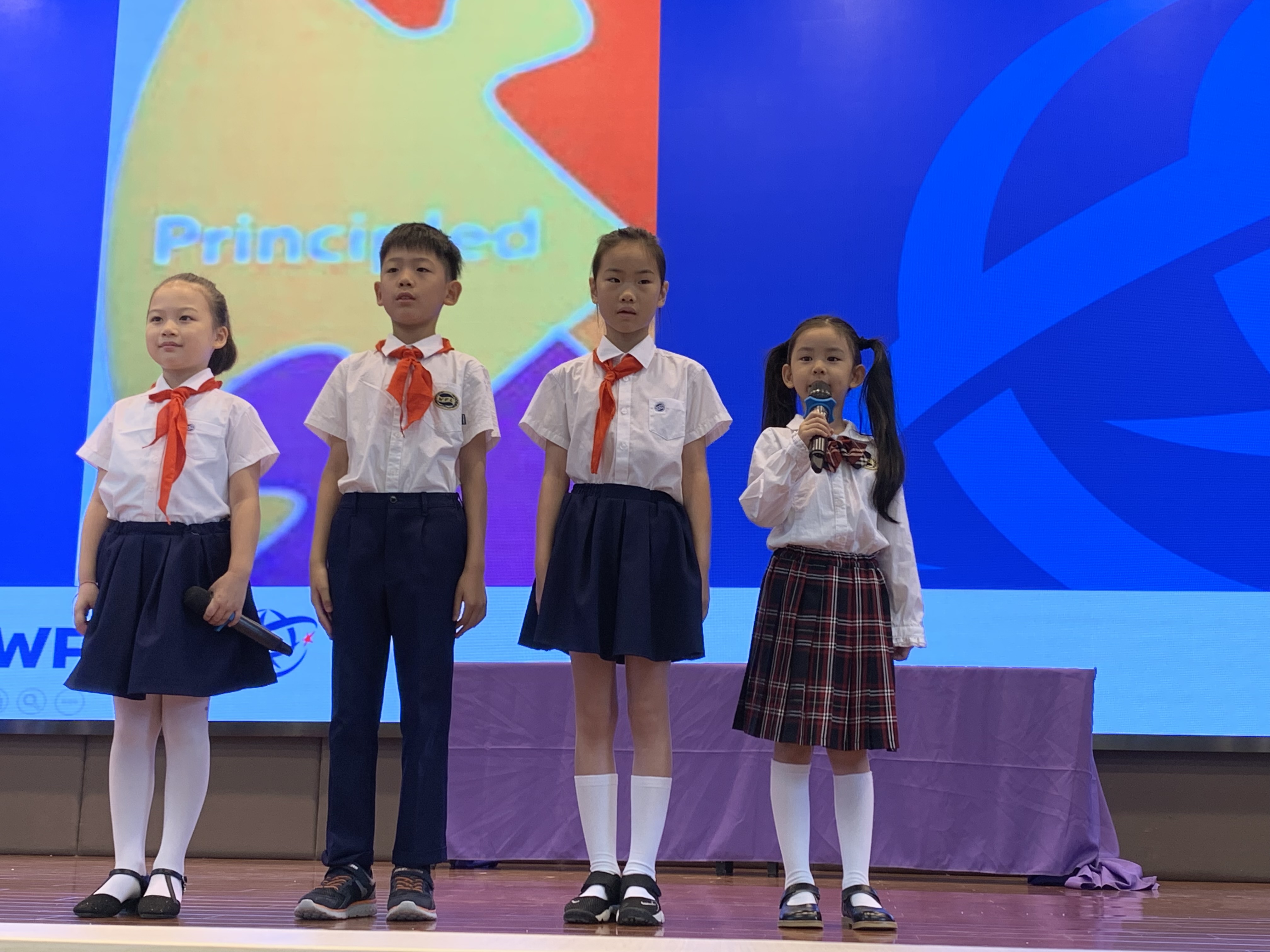 融合部的開學典禮結合“十大培養目標”之“Be Principled”(做一個有原則的人)為主題進行。孩子們坐在煥然一新的體育館里,感受學校猶如變魔術一樣,用僅僅兩個月暑假的時間,呈現出的一片“藍色海洋”。
