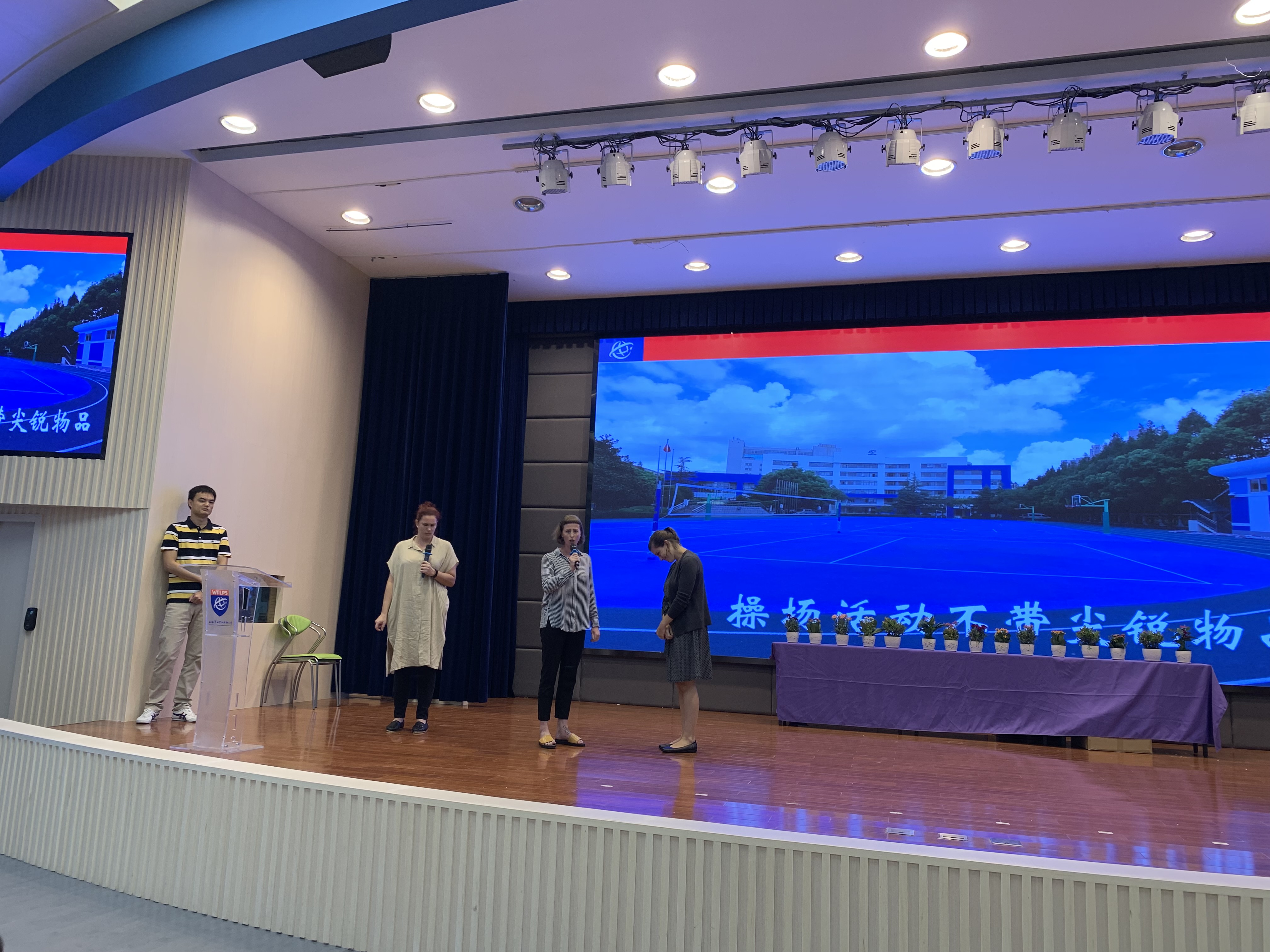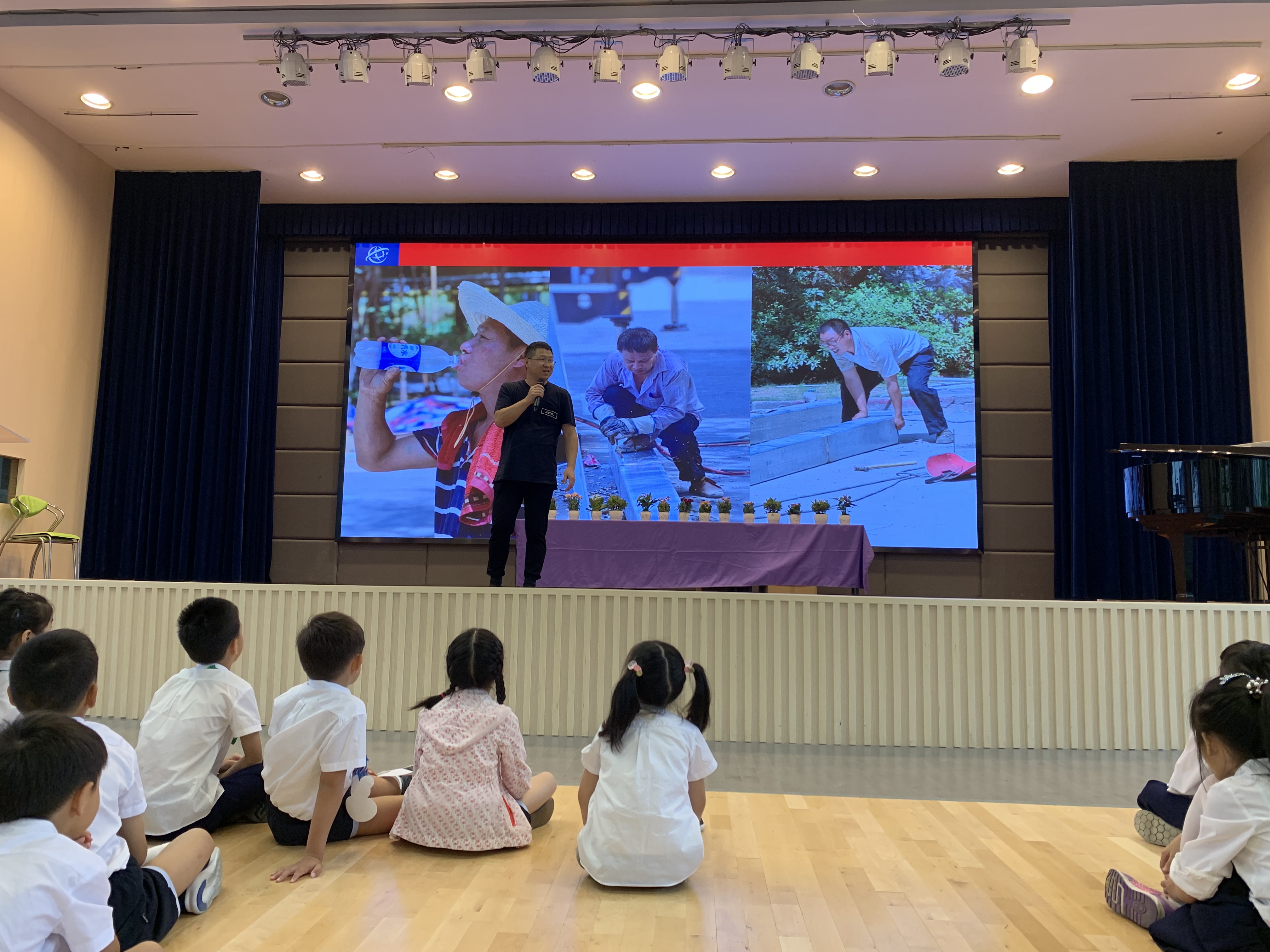 在這片“海洋”的背后,有著許多不為人知的故事,這其中少不了來自于兩個校區總工程師周錫雷和陳洪老師的日夜守候。陳洪老師上臺和大家一起分享了校園整修背后的故事,讓孩子們了解烈日酷暑中的酸甜苦辣,希望同學們能用心感知,做一個有原則的人,愛惜和守護世外的新校舍。