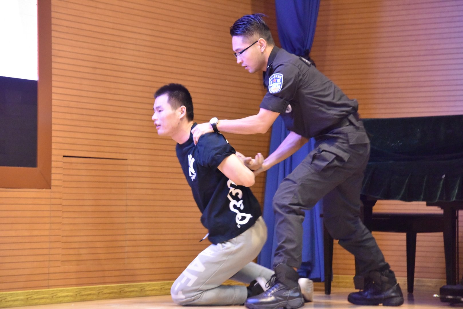 最后,由特警、反扒、警犬支隊聯合行動的上海市公安局城市軌道和公交總隊的警察叔叔們壓軸出場。反扒支隊的警官叔叔向我們展示了地鐵反扒的過程,當特警叔叔英勇地抓獲“小偷”時,全場歡呼鼓掌。