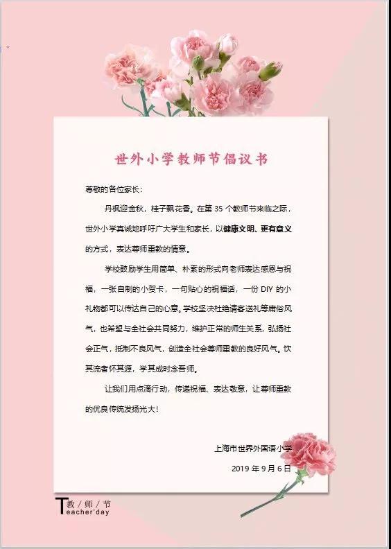 全體教師向家長們發出《倡議書》,呼吁廣大學生和家長,以健康文明、更有意義的方式,表達尊師重教的情誼。