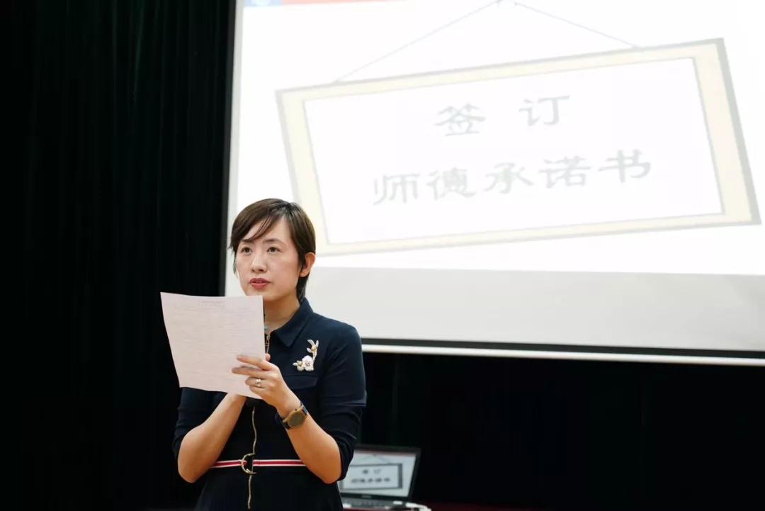 接著,副校長陳吉菁上臺與全體教師共同簽訂《教師師德承諾書》。全體教師共同踐行社會主義核心價值觀,積極推進和諧校園建設,做人民滿意的教師,堅決執行“十二不”,做到“不碰底線”。