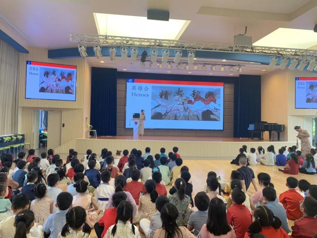 身著淺綠色旗袍的語文老師Vovo上臺,向大家介紹了本次“閱讀節(jié)”的中文活動。“閱讀節(jié)”要舉行“英雄會”,所謂英雄會就是扮演一些書中人物。他們可以是歷史人物,也可以是著名的科學(xué)家、藝術(shù)家等等。他們或是平凡,或是偉大,但都是我們身邊的“英雄”。另外在活動中還要進(jìn)行“中國禮贊”的詩朗誦和歌曲大聯(lián)唱。