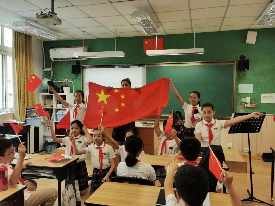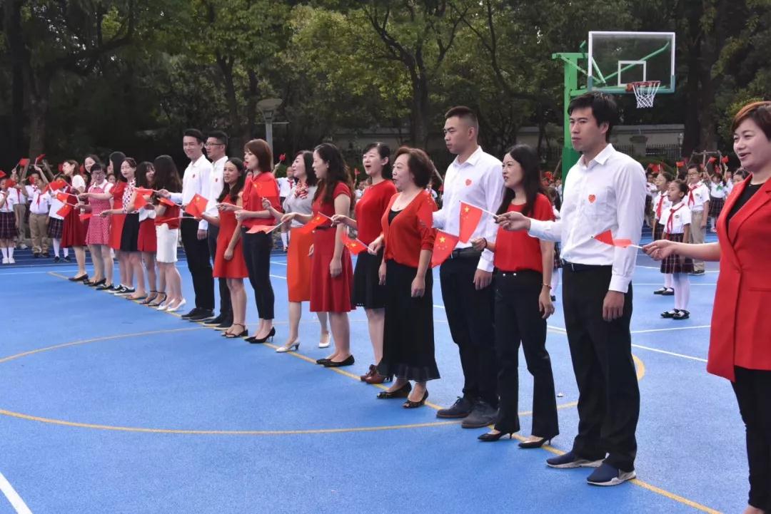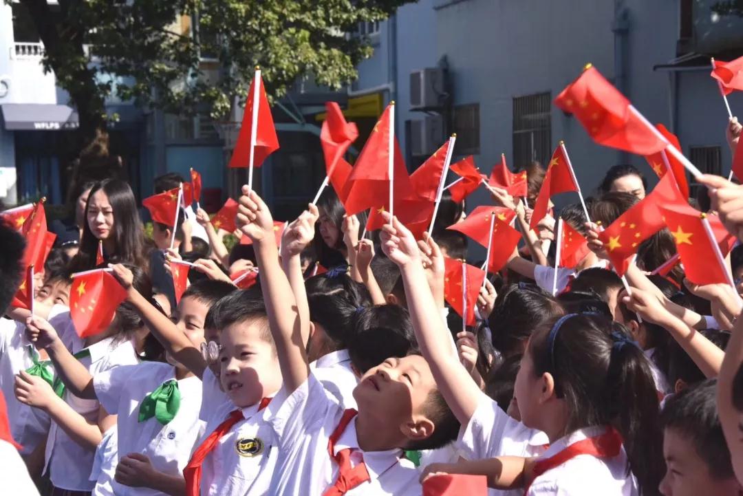 “我和我的祖國,一刻也不能分割……” 伴隨著優(yōu)美的歌聲,境內(nèi)部的全體師生用“紅歌快閃”的方式齊聚操場,隆重舉行“國旗下成長”——上海市百萬青少年慶祝中華人民共和國成立70周年升旗儀式。一面巨型國旗在我們中間傳遞,我們揮舞著小國旗一起放聲歌唱。每一句歌詞、每一個音符都表達了我們對祖國濃濃的熱愛和爭做新時代好隊員的堅定決心。