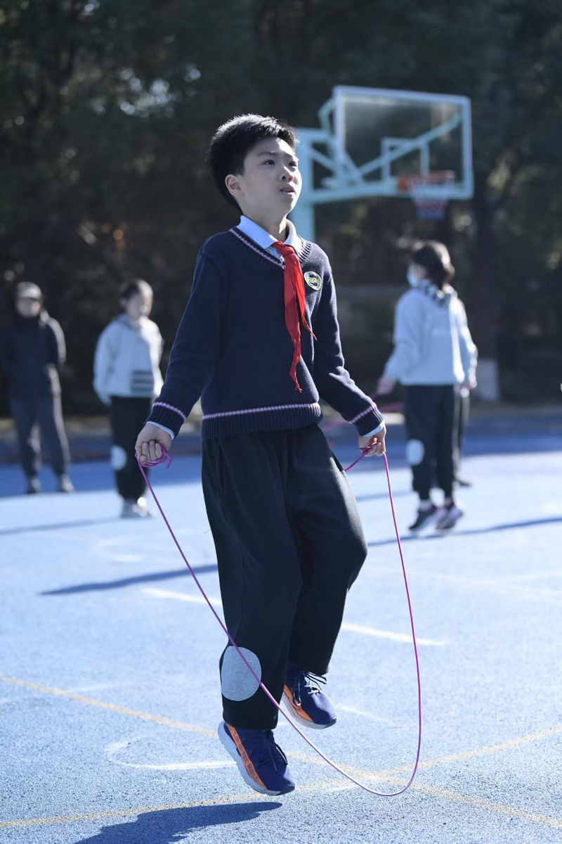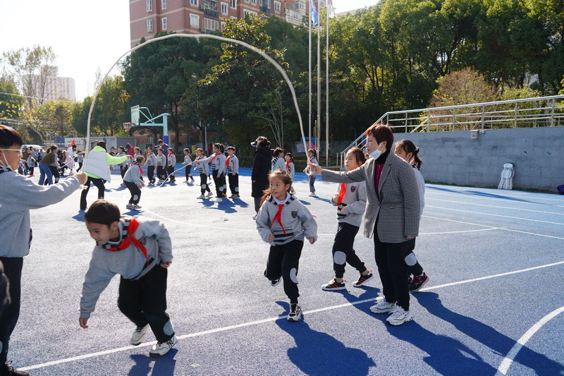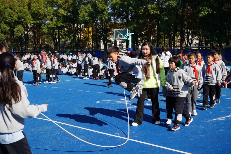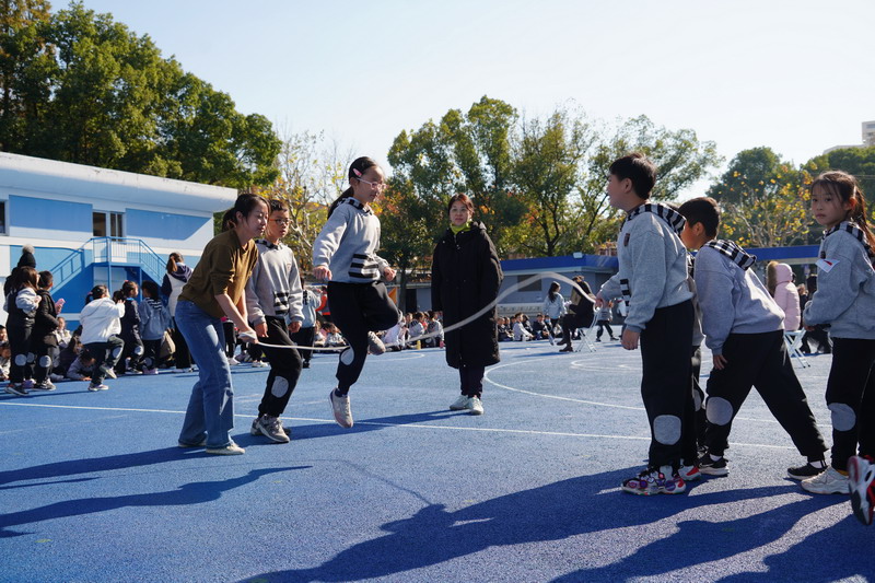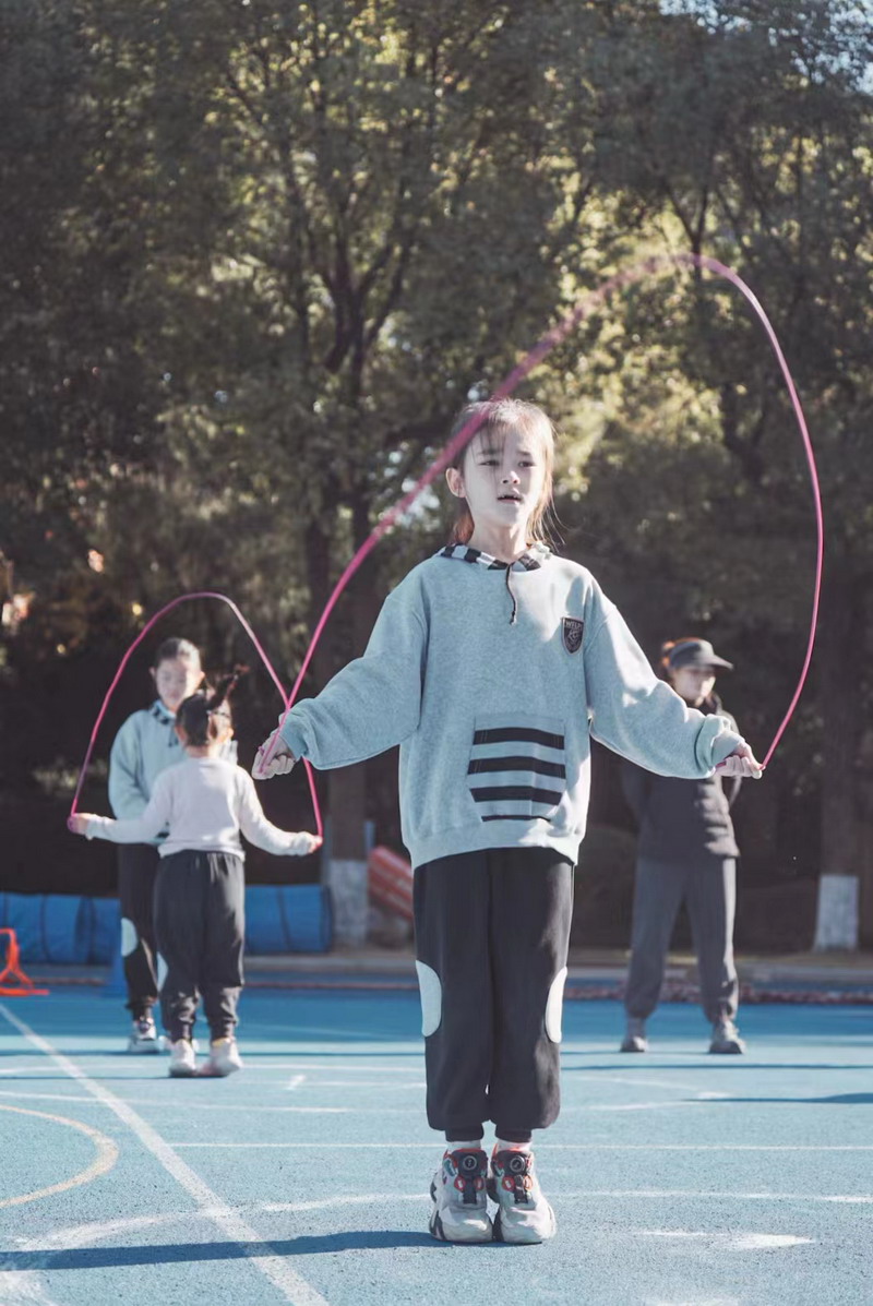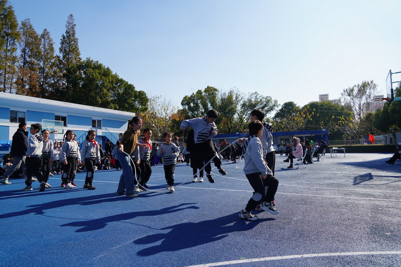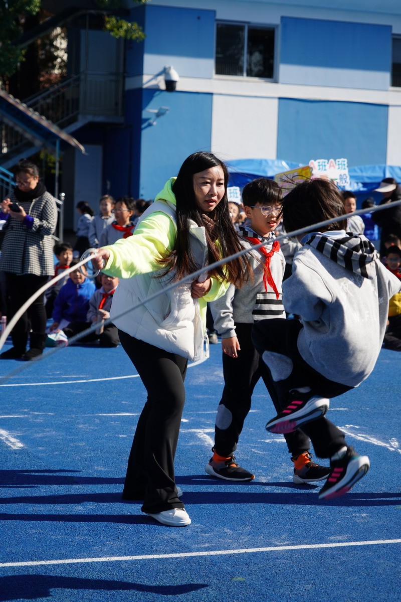 長繩比賽則是考驗同學們的團結協作。同學們一個接一個地往上跳,幾乎沒有斷的,像一只只靈活的小燕子,在繩子上面飛來飛去。