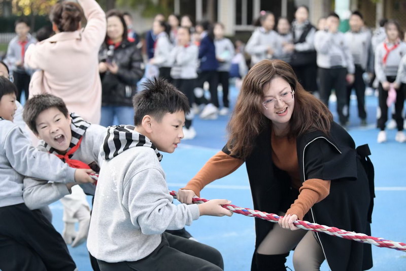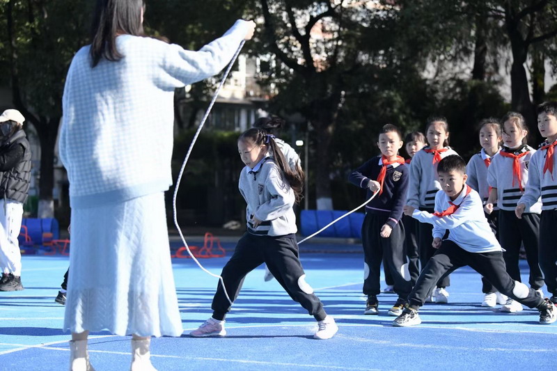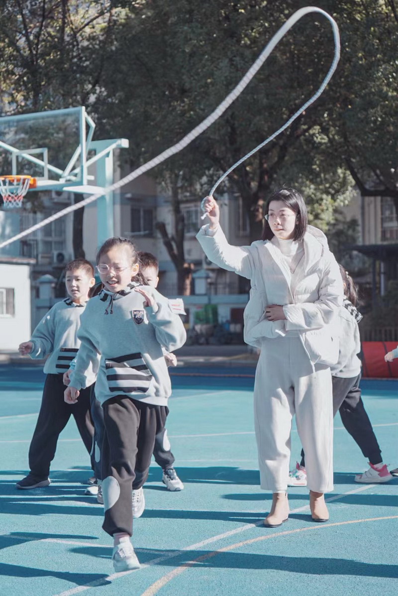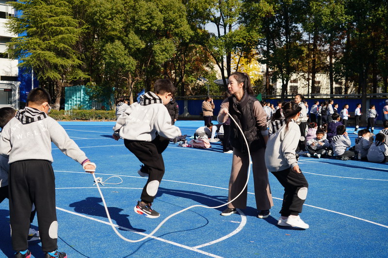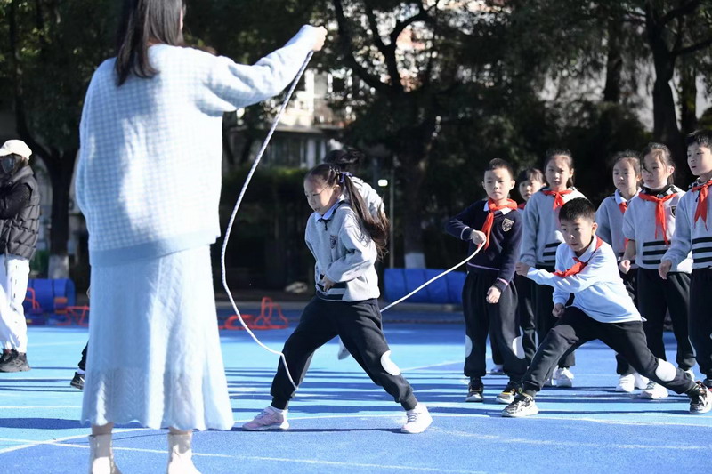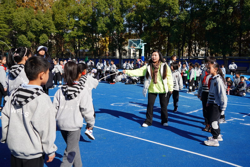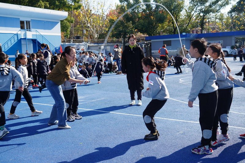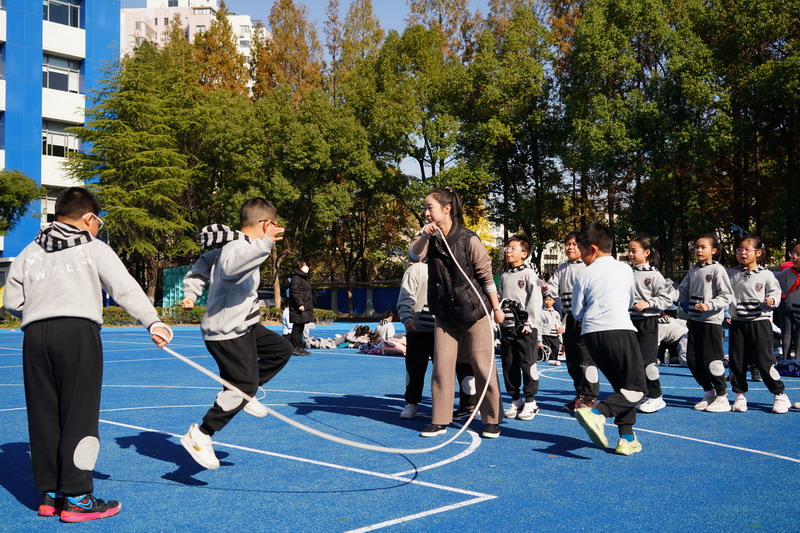 長繩比賽則是考驗同學們的團結協作。同學們一個接一個地往上跳,幾乎沒有斷的,像一只只靈活的小燕子,在繩子上面飛來飛去。