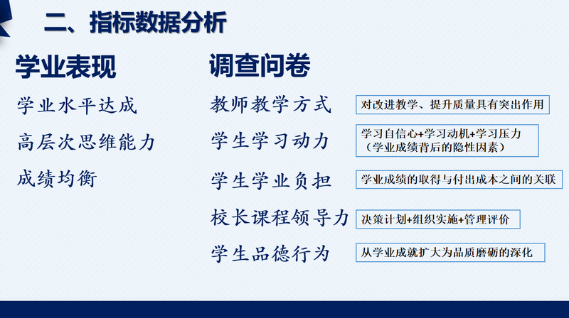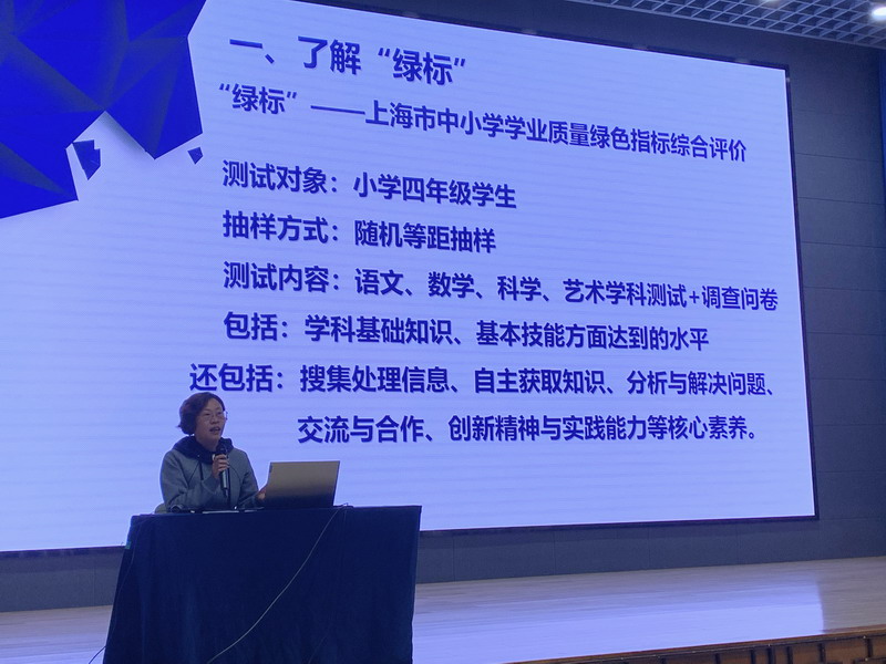 首先由閔校長介紹了《上海市中小學學業質量綠色指標綜合評價》的內容和2022年數據分析,“綠標”以學生學業質量的評價為切入口,全面關注學生的健康成長,引導建立科學的質量觀,建立教育質量的保障體系。分析報告的雷達圖顯示共有22個指標,我校的15個指標達到9級,涵蓋了課程規劃實施與評價、學業標準達成度、教學理念、學校歸屬感、師生關系、學習動機、行為規范、藝術素養等方面,從多角度科學評價學生學業質量。透過更多學科細化數據的分析結果,老師們也認識到教學中存在的“薄弱點”,為進一步精準發現問題,客觀歸因分析和尋找適切的改進措施奠定了基礎。